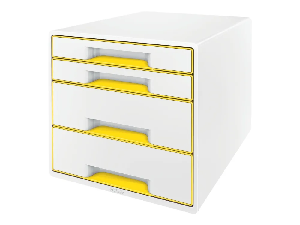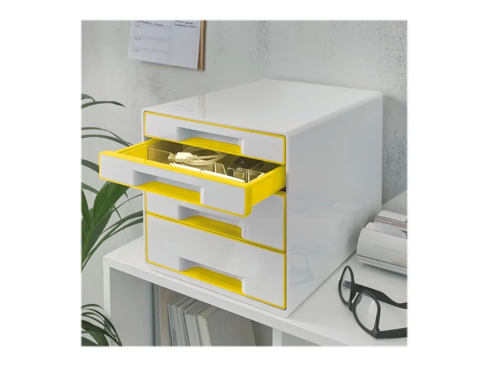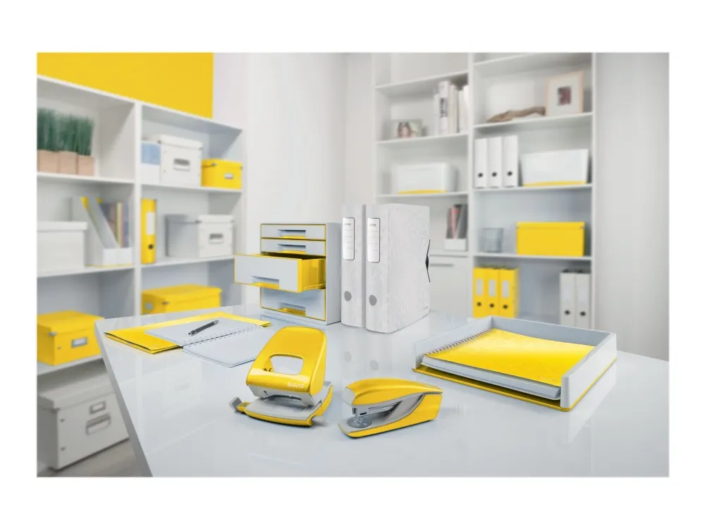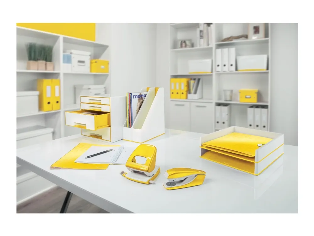 Katseenvangitseva, korkealaatuinen WOW CUBE häikäisevän ja tyylikkään kaksivärisenä, kiiltävällä viimeistelyllä pinnalla on täysin yhteensopiva muiden Leitz WOW tuotesarjan tuotteiden kanssa.