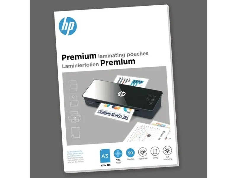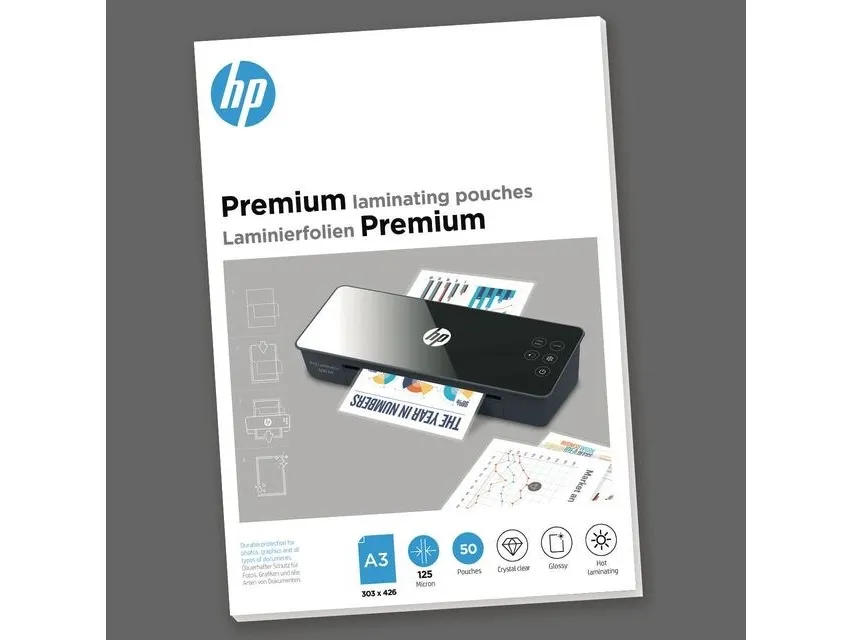 Protect your A3 documents from wear and tear and give them a high-quality feel with HP Premium laminating pouches. The 303 mm x 426 mm transparent films have a glossy finish and are suitable for hot lamination only. With a film thickness of 125 microns, they are suitable for all HP OneLam and HP Pro Laminators which can handle the DIN A3 format. Of course, they are also compatible with hot laminators of other manufacturers, provided that the specified micron number is not exceeded. The laminating pouches are available in a folding box with 50 pieces. By the way: The HP Premium laminating pouches in DIN A3 are also available in 80 microns and 250 microns.HP 9127. Product colour: Transparent, Surface finish: Glossy, Format: DIN A3, 303 mm x 426 mm. Width: 307 mm, Depth: 430 mm, Height: 15 mm. Quantity per pack: 50 pc(s)