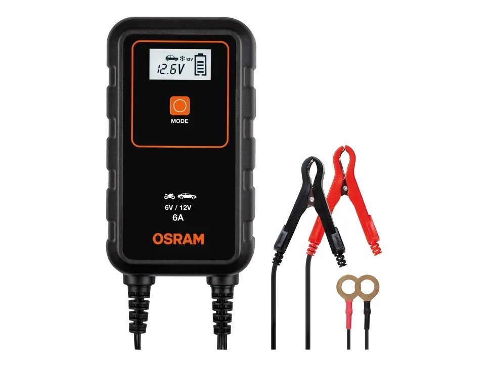 OSRAM automatikoplader BATTERYcharge 906 - 6A intelligent oplader og batteri-vedligeholdelsesenhed Til store batteristørrelser på bilerIntelligent batteriopladnings- og batterivedligeholdelsesapparat med flertrins opladningscyklus på OSRAM BATTERYcharger 906 er en intelligent 6A-oplader og en batterivedligeholdelsesenhed til 6V- til 12V-køretøjer samt de fleste kassevogne og leveringsvogne. Ved et tryk på en knap startes der en 7-trins opladningscyklus til lithiumbatterier og til bly-syre-/AGM-batterier en 9-trins opladningscyklus. Har et digitalt display til forenkling af ladeprocessen og en lang række sikkerhedsfunktioner inklusive beskyttelse mod omvendt polaritet og overspændingsbeskyttelse. Tilslut den ganske enkelt og sørg for, at opladeren venter på bilbatteriet: Det tænder automatisk i langtidsvedligeholdelsestilstand, når batteriet er fuldt opladet.