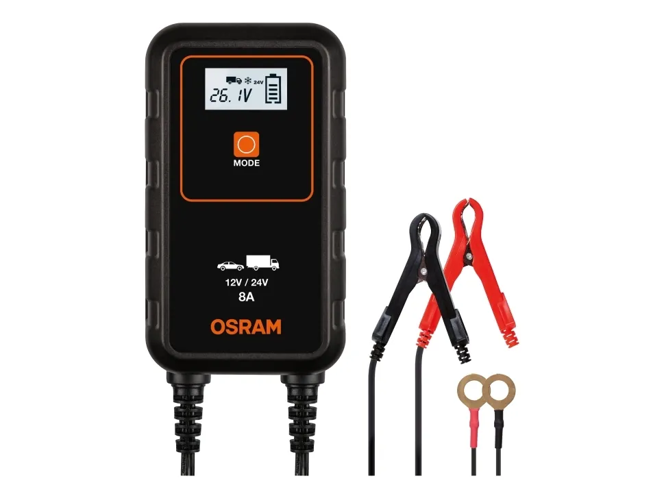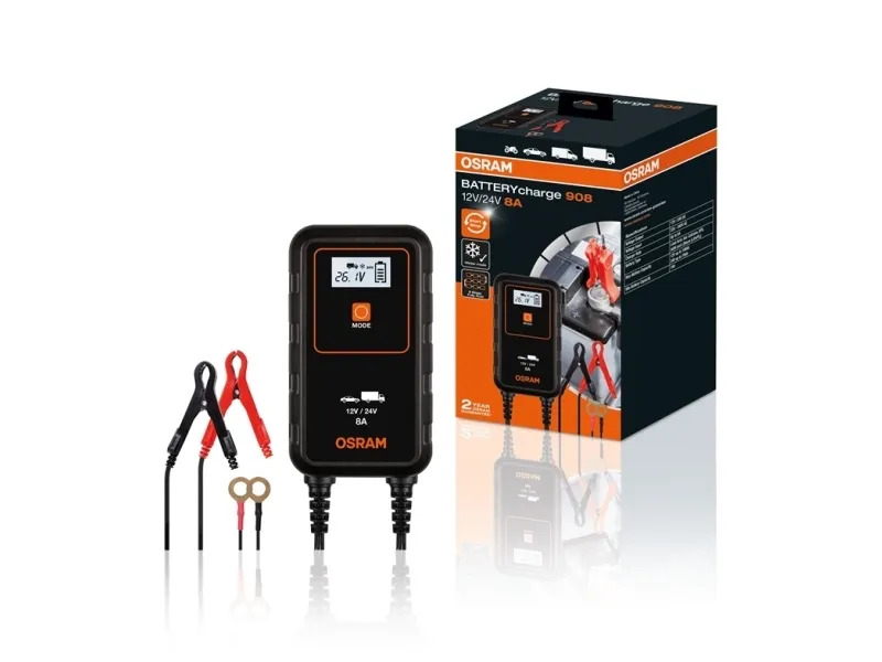 OSRAM BATTERYcharge 908 - 8A Intelligeret oplader og batteri-vedligeholdelsesapparat Store batteristørrelserIntelligent batteriopladnings- og batterivedligeholdelsesapparat med flertrins opladningscyklus på OSRAM BATTERYcharger 908 er en intelligent 8A-oplader og batterivedligeholdelsesapparat til 12V- til 24V-køretøjer som de fleste biler, leveringsvogne, kassevogne og mindre lastbiler. Ved et tryk på en knap startes der en 7-trins opladningscyklus til lithiumbatterier og til bly-syre-/AGM-batterier en 9-trins opladningscyklus. Har et digitalt display til nem betjening, også ved dårlige lysforhold. Indeholder for din sikkerhed funktioner som beskyttelse mod omvendt polaritet og overspændingsbeskyttelse. Tilslut den ganske enkelt og sørg for, at opladeren venter på bilbatteriet: Det tænder automatisk i langtidsvedligeholdelsestilstand, når batteriet er fuldt opladet.