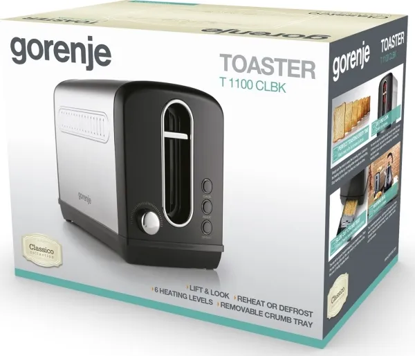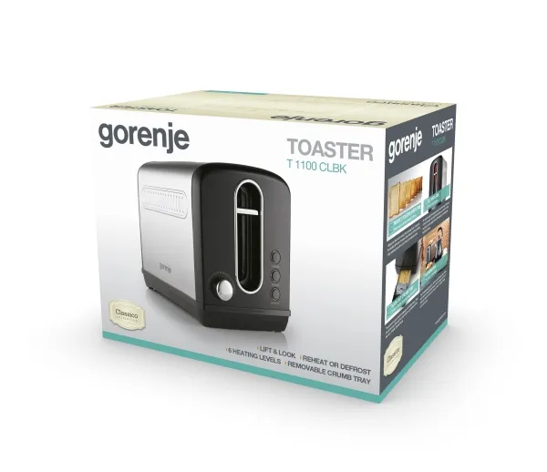 Discover the Gorenje T1100CLBK toaster, a blend of functionality and style for your kitchen. This toaster is designed to meet your toasting needs with features like defrost and reheat functions, 6 browning levels, and a convenient slide-out crumb tray for easy cleaning. The 1150 W power consumption ensures your bread is toasted efficiently, while the non-slip feet and automatic eject function add an extra layer of safety and convenience. Whether you're preparing breakfast or an afternoon snack, this toaster offers a combination of efficiency, versatility, and ease of use.