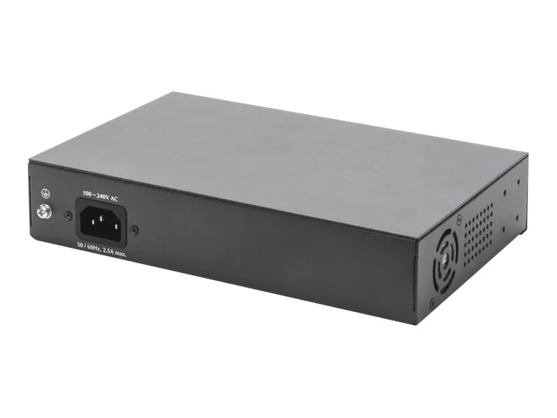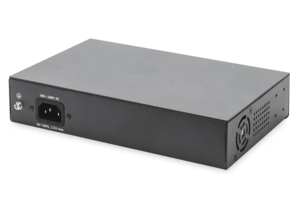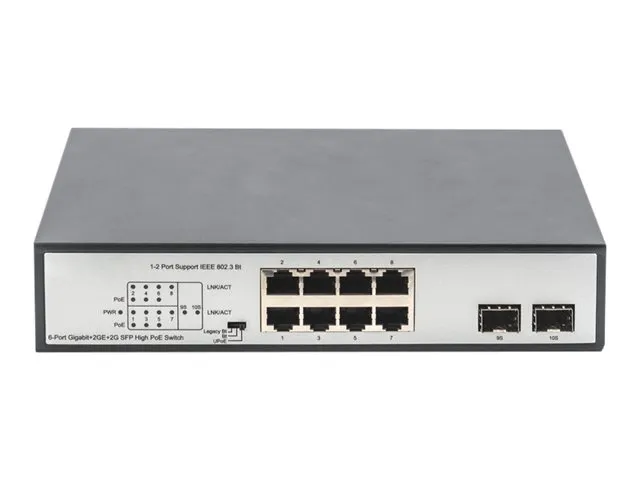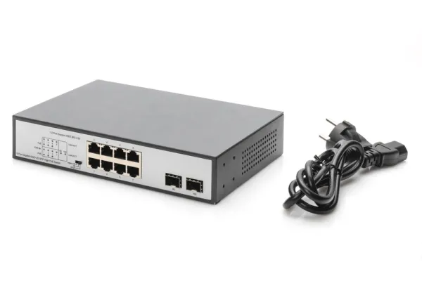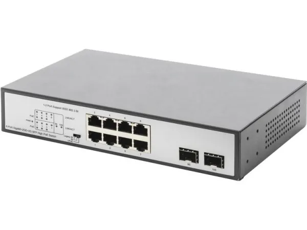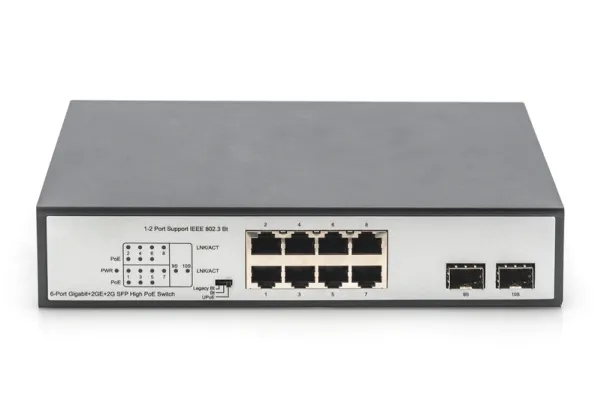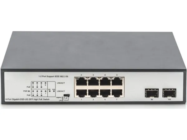 The DIGITUSR 8 port gigabit PoE Switch provides you with a multi functional switch for many application scenarios. You can use all 8 ports for conventional network devices without a PoE supply. You can use six ports for PoE-cable network devices, two of those ports even with 90 watt (IEEE 802.3 bt) per port. The remaining 4 ports support IEEE 802.3at/af devices up to 30 watt. Two SFP up link ports are also integrated, which you can fit with SFP modules for fiber optic or copper technology. The gigabit standards continue to be supported with data transfer rates of up to 1000 Mbps, auto MDI/MDIX and auto negotiation for the RJ45 ports. The Switch also has 3 modes: LegacyBT,BT and UPoE that can be adjusted on the front side with a DIP Switch. You can implement conventional network applications with this Gigabit PoE Switch and also supply high-performance network devices, such as PoS systems, access control systems, a surveillance and parking-lot system with electricity. A total budget of 180 W is provided here for PoE devices.