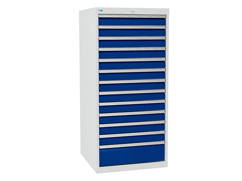 Skuffesektion, tyskproduceret kvalitet i størrelse h x b x d = 1519 x 705 x 736 mm med centrallås, integrerede skuffegreb med etiketholder, væltesikring og et stort udvalg af tilbehør. Skufferne har normalt 88% udtræk, hver med en kapacitet på 100 kg fordelt last. Enkelte skuffer har 100% udtræk, disse skuffer har kapacitet på hele 200 kg - Se tabellen under for detaljeret overigt over de skuffetyper som indgår. Værktøjsopbevaring i serien 700/05 benyttes for fritstående placering, gerne i kombination med trucksokkel for enkel flytning med palleløfter eller gaffeltruck, alternativt på understel m/hjul. Ønsker du praktisk og overskuelig inddeling af skufferne, kan du vælge i vort store udvalg af skuffeinddelinger.Skuffesektionen består af værktøjskuffer med følgende højder:50mm: 1 stk - 88% / 100kg75 mm: 1 stk - 88% / 100kg100 mm: 2 stk - 88% / 100kg125 mm: 2 stk - 88% / 100kg150 mm: 1 stk - 88% / 100kg175 mm: 1 stk - 88% / 100kg200 mm: 1 stk - 88% / 100kg300 mm: 1 stk - 88% / 100kg