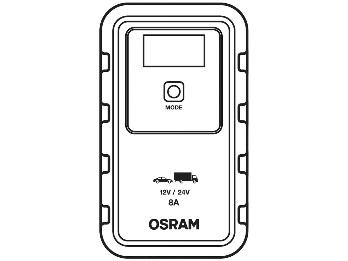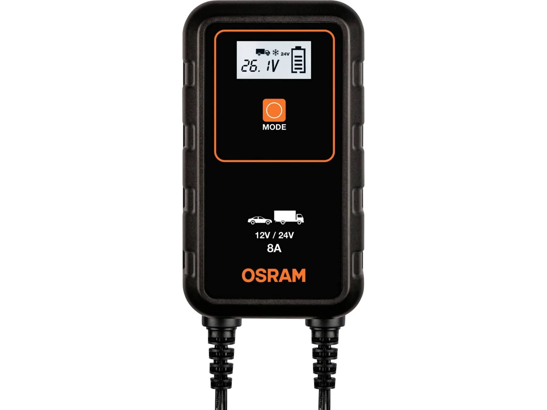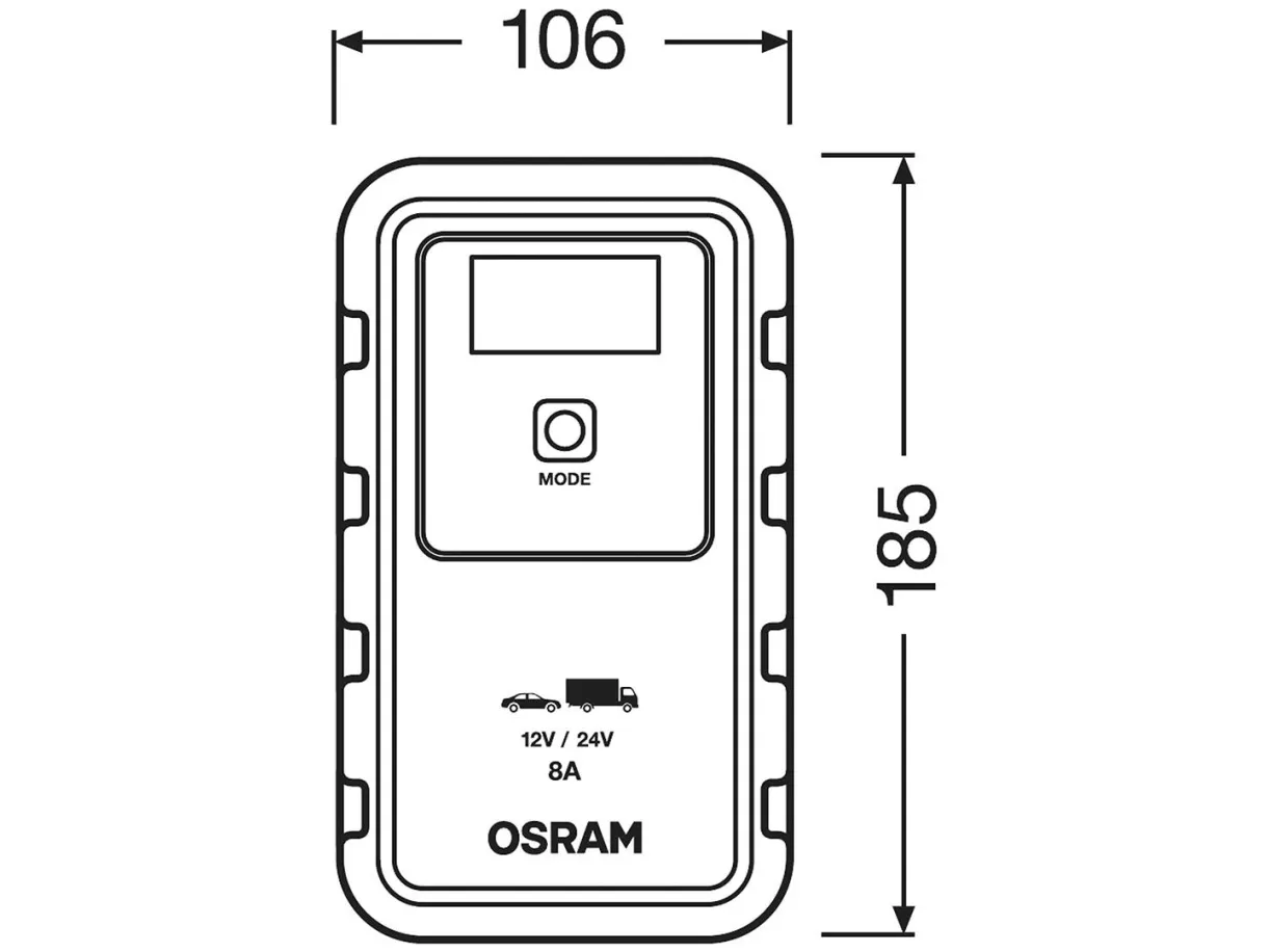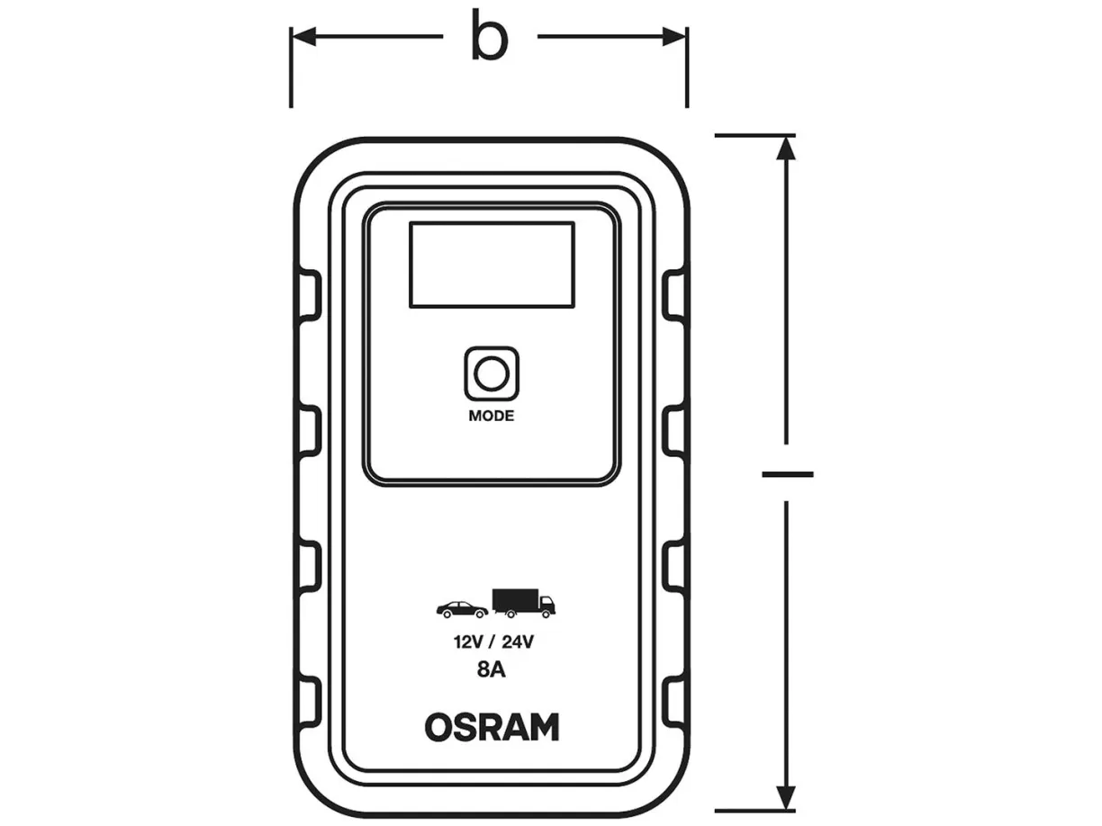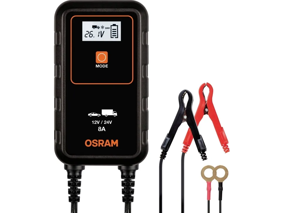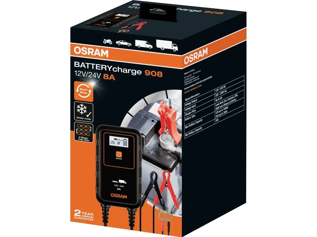 OSRAM BATTERYcharge 908 - 8A Intelligeret oplader og batteri-vedligeholdelsesapparat Store batteristørrelserIntelligent batteriopladnings- og batterivedligeholdelsesapparat med flertrins opladningscyklus på OSRAM BATTERYcharger 908 er en intelligent 8A-oplader og batterivedligeholdelsesapparat til 12V- til 24V-køretøjer som de fleste biler, leveringsvogne, kassevogne og mindre lastbiler. Ved et tryk på en knap startes der en 7-trins opladningscyklus til lithiumbatterier og til bly-syre-/AGM-batterier en 9-trins opladningscyklus. Har et digitalt display til nem betjening, også ved dårlige lysforhold. Indeholder for din sikkerhed funktioner som beskyttelse mod omvendt polaritet og overspændingsbeskyttelse. Tilslut den ganske enkelt og sørg for, at opladeren venter på bilbatteriet: Det tænder automatisk i langtidsvedligeholdelsestilstand, når batteriet er fuldt opladet.