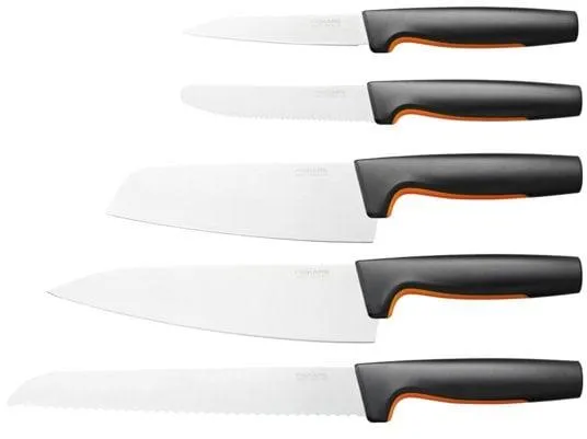 For cooks who appreciate smartly designed, easy-care kitchen tools, Fiskars Functional Form™ Large starter set includes the five most commonly used knives. Each knife is designed for function, comfort and ease, with durable, Japanese stainless steel blades and ergonomic handles. Use the Large cook’s knife to cut meat, chop vegetables, mince herbs and more. The long, serrated blade of the Bread knife is ideal for slicing bread with a hard crust. The broad blade of the Santoku knife is ideal for preparing meats, fish and vegetables, while the Paring knife peels and cuts fruits and vegetables and the serrated Tomato knife slices fruits and vegetables with skin. Each handle features SoftGrip™ at your fingertips and a deep finger guard for a comfortable, safe fit in your hand. Like all Functional Form™ knives, these knives are dishwasher safe for simple, everyday cleaning.Fiskars 1057558. Product type: Knife set, Blade material: Stainless steel, Blade colour: Stainless steel. Blade length: 19.9 cm, Knife 2 blade length: 21.3 cm, Knife 3 blade length: 16 cm. Number of products included: 5 pc(s)