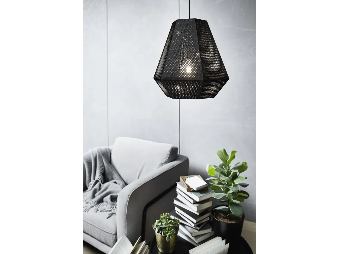 Den hængende lampe CHIAVICA er lavet med en diamantformet lampeskærm i perforeret plade i Nickel-Nero. Gennem den perforerede lampeskærm opstår fascinerende lys- og skyggeeffekter, så snart lampen tændes. Skærmen er ophængt med et sort tekstilkabel fra en metal baldakin i Nickel-Nero. Den hængende lampe med sit moderne design tilbyder en stilfuld belysning i stuen og spisestuen over spisebordet. Lyskilden er ikke inkluderet. Lampen passer til enhver lyskilde med E27-fatning. CHIAVICA pendlen er lavet med en diamantformet lampeskærm lavet af perforeret metalplade i nikkel-nero. Den perforerede lampeskærm skaber fascinerende lys- og skyggespil, så snart lampen tændes. Paraplyen blev ophængt med et sort tekstilkabel fra en metalbaldakin i nikkel Nero. Hængelampen med sit moderne design giver stilfuld belysning i stuen og spisestuen over spisebordet. Pæren medfølger ikke. Armaturet er velegnet til enhver pære med en E27-sokkel.