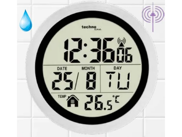Radio-ohjattava seinäkello kosteisiin tiloihin WS3005Mahdollisuus manuaaliseen asetukseen - Kosteussuojattu - Sisälämpötila - Päivämäärä - Viikonpäivä - Imukuppikiinnitys sileille pinnoille - Rengas ripustamista varten - Sijoitus pöydälle. Pieni, digitaalinen langaton seinäkello kuiviin ja kosteisiin tiloihin. Sopii erinomaisesti kylpyhuoneisiin. Asennus imukupilla on mahdollista.