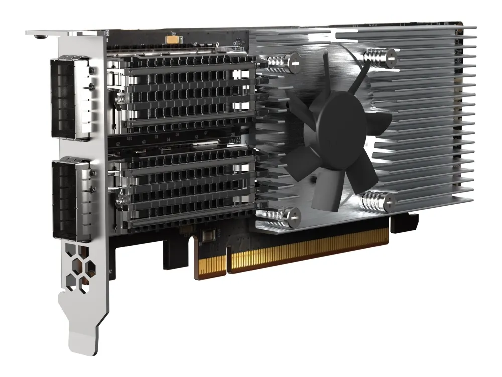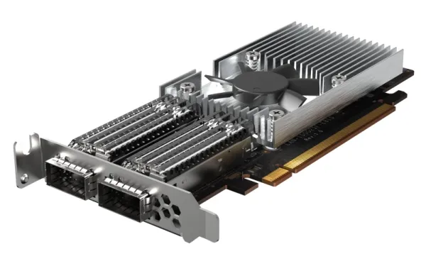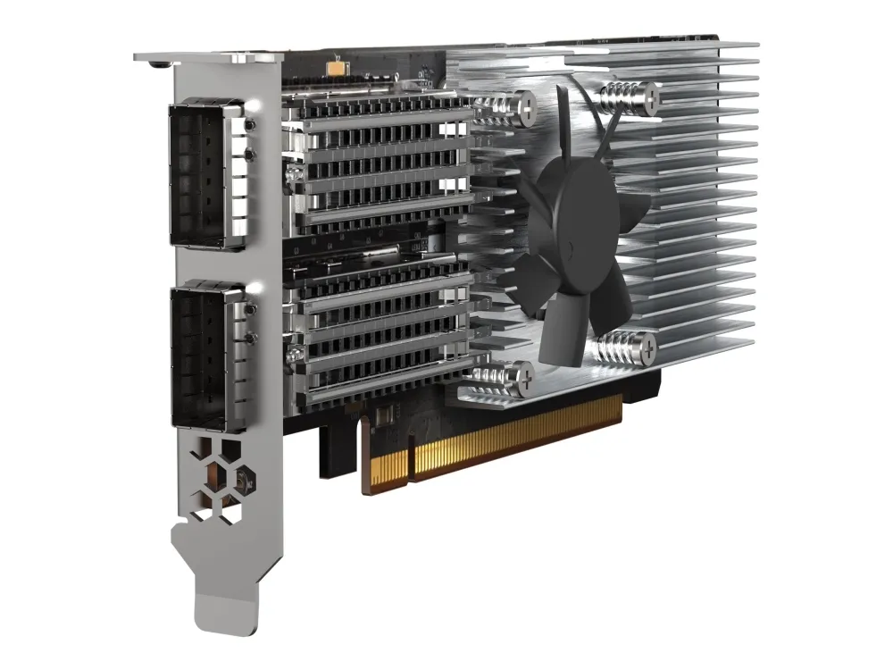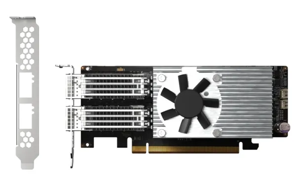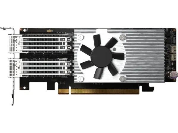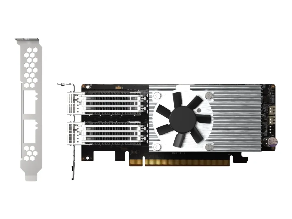 The dual-port QXG-100G2SF-E810 100 GbE network expansion card with Intel Ethernet Controller E810 supports PCIe 4.0 and provides up to 100Gbps bandwidth to overcome performance bottlenecks. With iWARP/RDMA and SR-IOV support (available soon), the QXG-100G2SF-E810 greatly boosts network efficiency and is ideal for I/O-intensive and latency-sensitive virtualization and data centers. The QXG-100G2SF-E810 is a perfect match for all-flash storage to realize the highest performance potential for ever-demanding IT challenges.