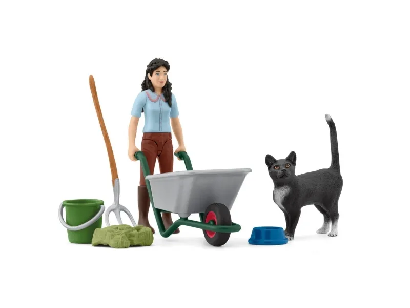 Emily's mucking out and grooming set contains all the equipement you need to lovingly care for all the animals in the stable. Will you help Emily push the heavy wheelbarrow and feed the cat?