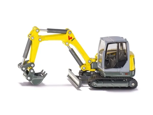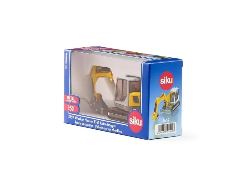 Compact helper on the construction siteCompact, versatile, yet still powerful: The Wacker-Neuson ET65 chain excavator is the all-rounder on the construction site. In 1:50 scale, the chain excavator from siku travels on movable rubberised chains. The rotating machine housing, the movable pusher blade, and the movable excavator arm with bucket promise lots of playing fun on the playroom construction site.