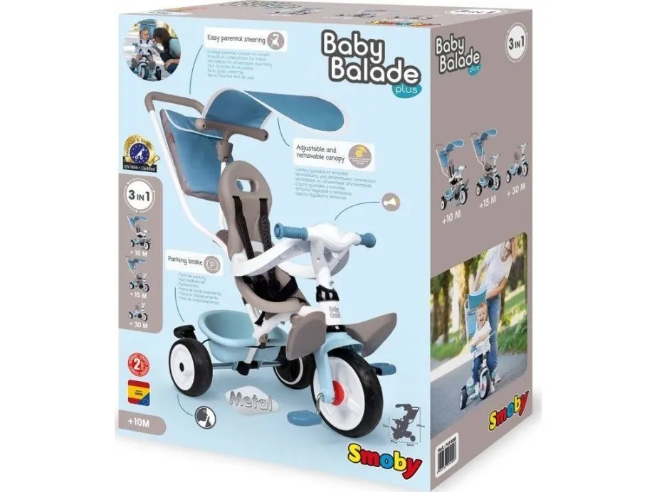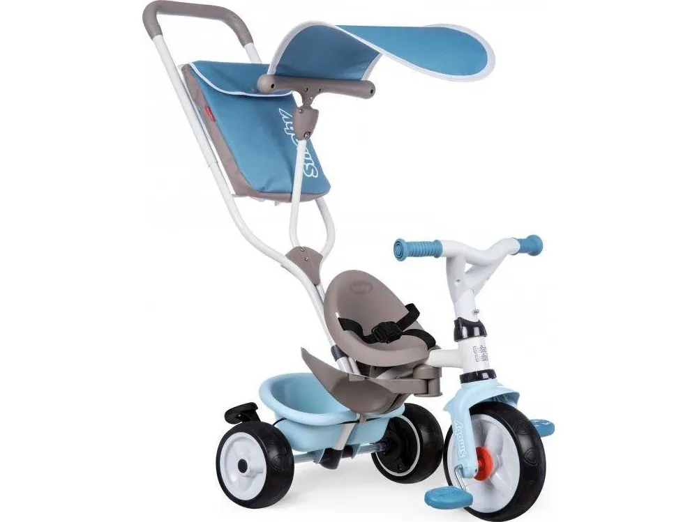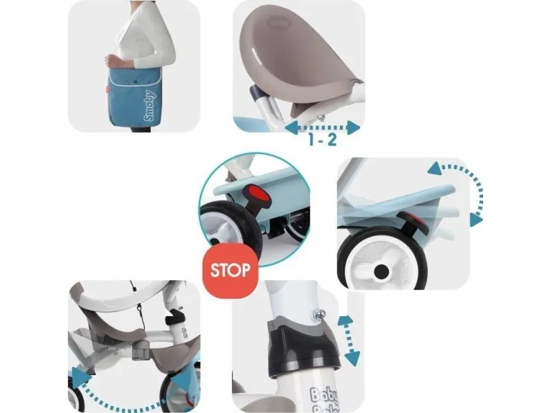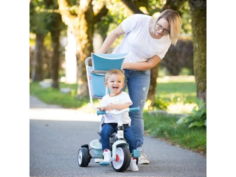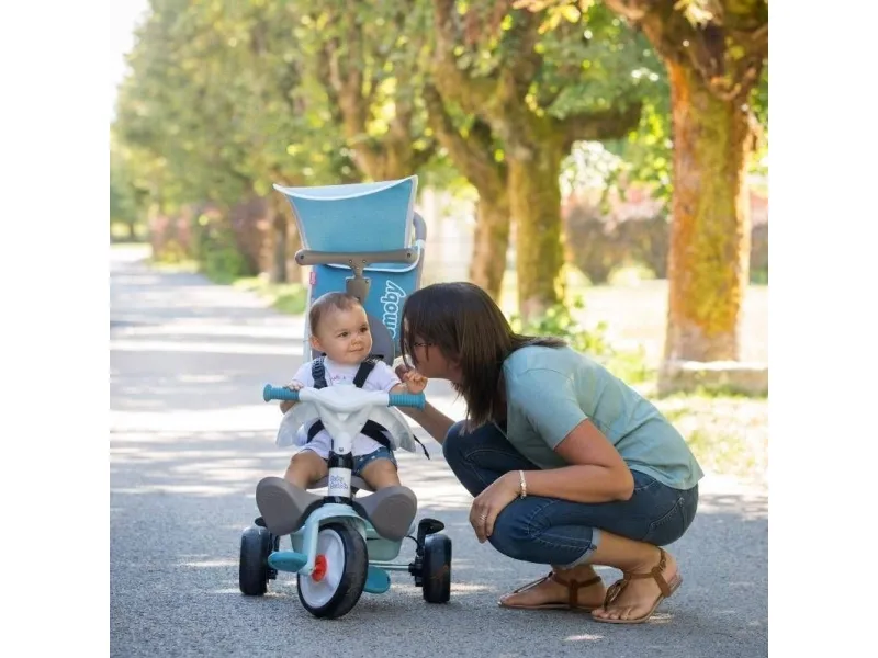 An evolutive tricycle that will accompany your child from 10 months to 3 years old and over. Strong and modern, this metal tricycle has a lot of features ensuring maximum of safety. With the safety harness and rollbar, and the retractable footrest, your little-one will be perfectly maintained in the seat thanks to high headrest and 5 points harness. Thanks to the large adjustable parental handle and steering system, you can easily steer the tricycle : A light pressure on one side or the other of the parental handle makes it possible to turn the front wheel! You could easily transfer the parent’s control to the child and vice versa. The soft and silent wheels (EVA) and the rotating UV-proof canopy ensure peaceful and enjoyable walks. The soft handles offer a safe and comfortable grip. It is also equiped with a parking brake. Very practical, the removable bag with a handle will allow you to store your keys and the snacks for your child. The tilting skip and the horn integrated on the roll bar will also entertain your child. Once your child has gown up, you can let him go on an adventure by simply removing most of the equipment. For children aged 10 months and over - Made in Spain.