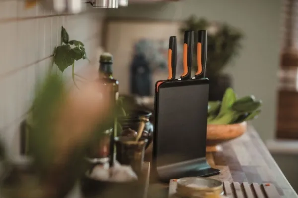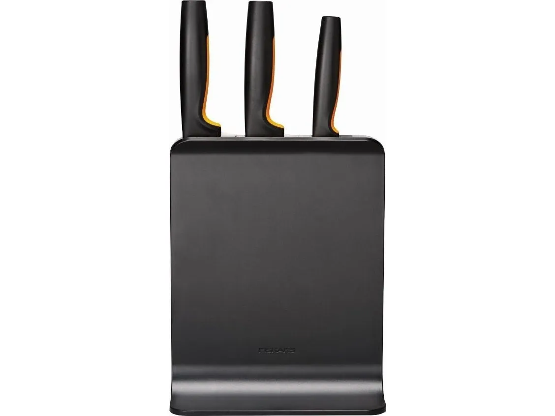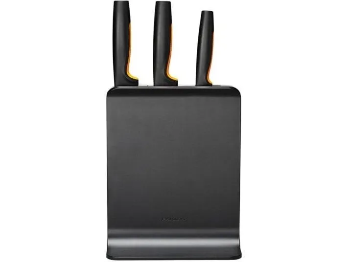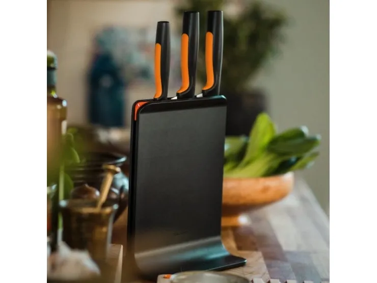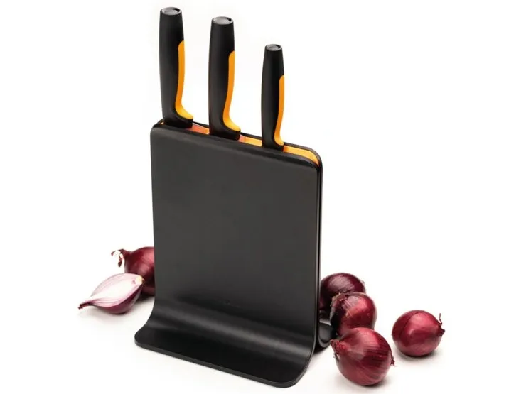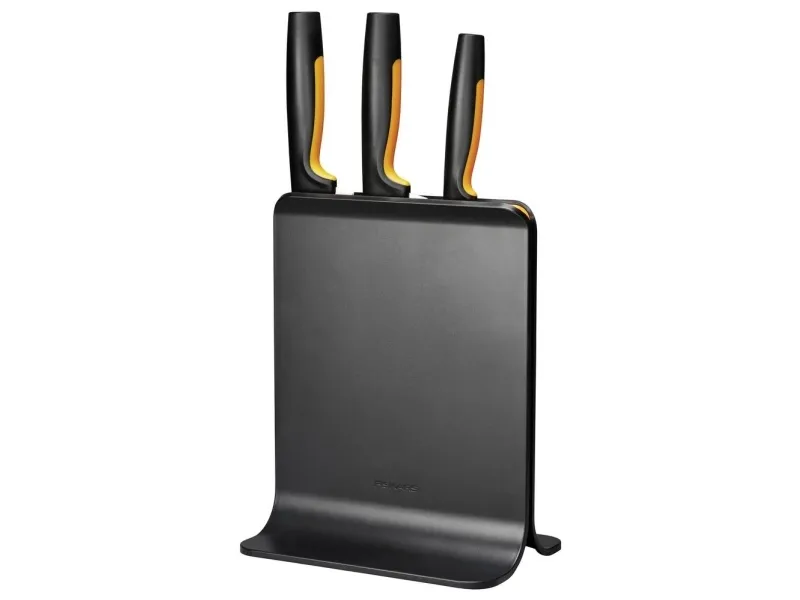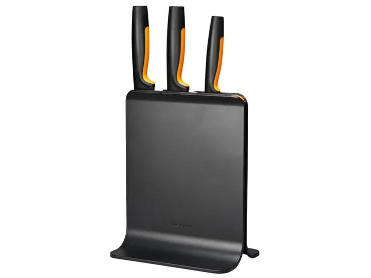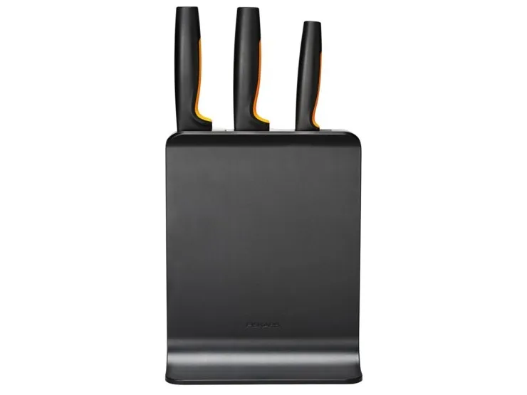 For cooks who appreciate smartly designed, easy-care kitchen tools, Fiskars Functional Form™ Knife block is an all-around, everyday essential, featuring attractive, compact, upright knife storage with easy-access slots that allow for placement under low-hanging kitchen cabinets. Made of plastic, this modern knife block includes three of the most commonly used knives: A Large cook’s knife, Santoku knife, and Paring knife. Each of the knives is designed for function, comfort and ease, with durable, Japanese stainless steel blades and ergonomic handles with SoftGrip™ touchpoints and deep finger guards. They’re all dishwasher safe for simple, everyday cleaning. Designed in Finland.