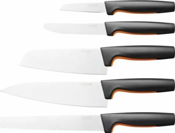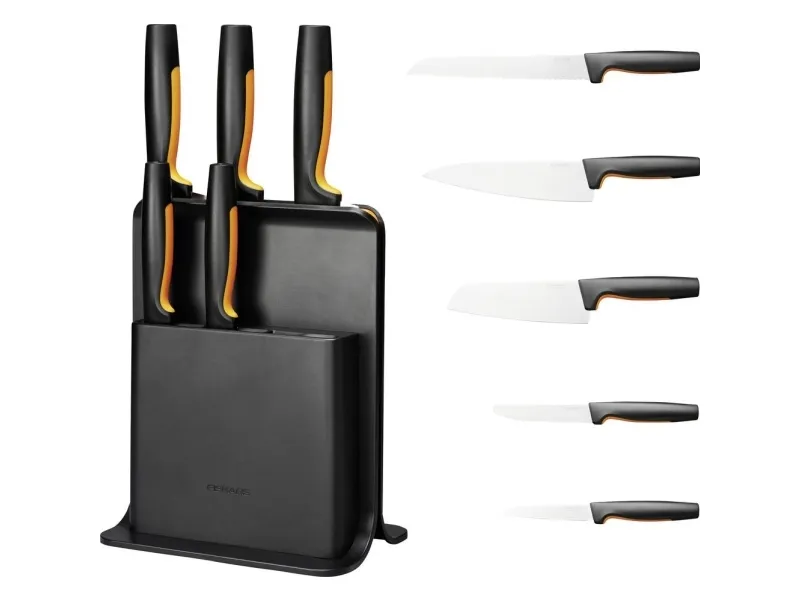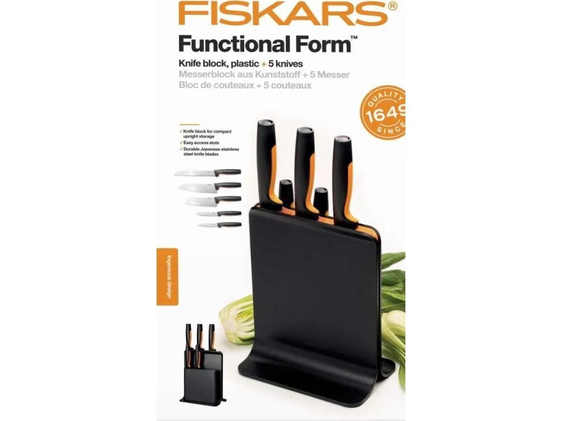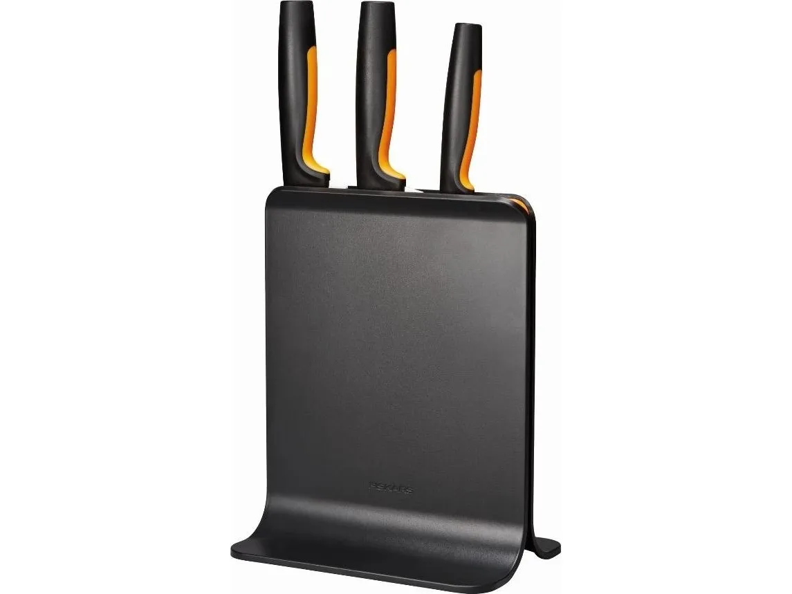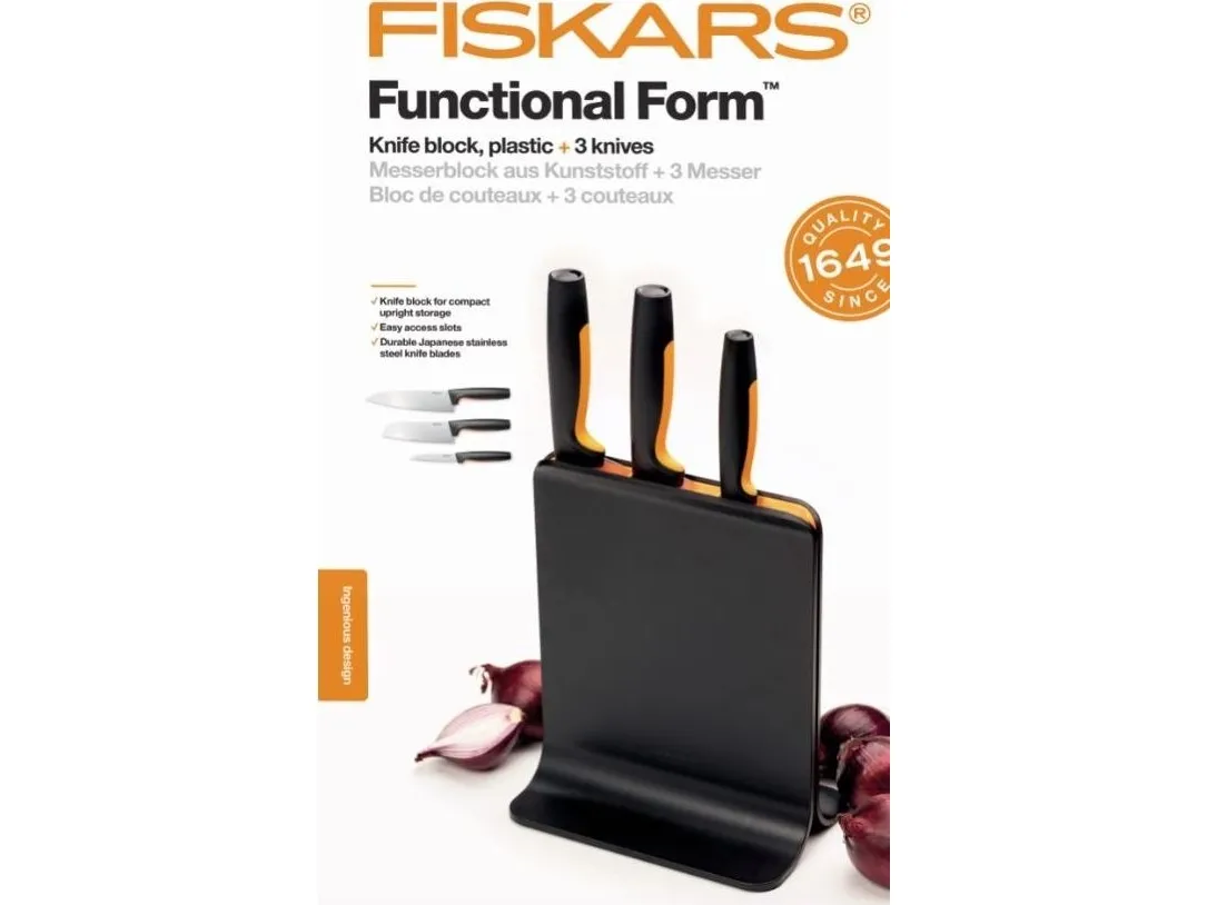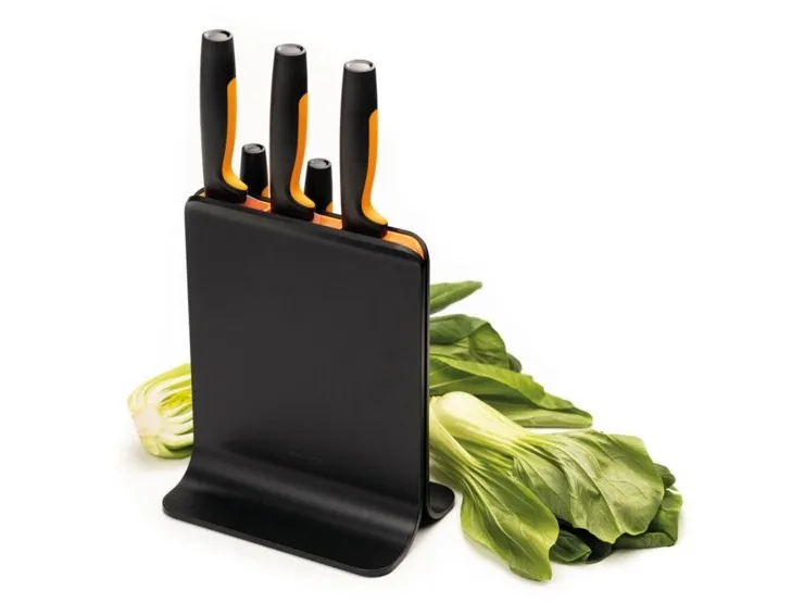 For cooks who appreciate smartly designed, easy-care kitchen tools, Fiskars Functional Form™ Knife block is an all-around, everyday essential, featuring attractive, compact, upright knife storage with easy-access slots that allow for placement under low-hanging kitchen cabinets. Made of plastic, this modern knife block includes three of the most commonly used knives: A Large cook’s knife, Santoku knife, and Paring knife. Each of the knives is designed for function, comfort and ease, with durable, Japanese stainless steel blades and ergonomic handles with SoftGrip™ touchpoints and deep finger guards. They’re all dishwasher safe for simple, everyday cleaning. Designed in Finland.