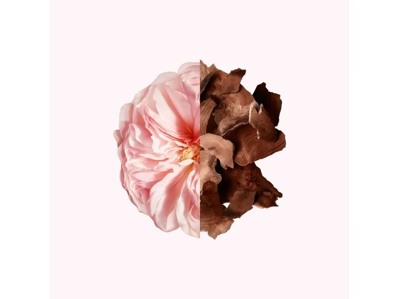 Luscious Rose flirts with enveloping tones of musky Blond Wood.