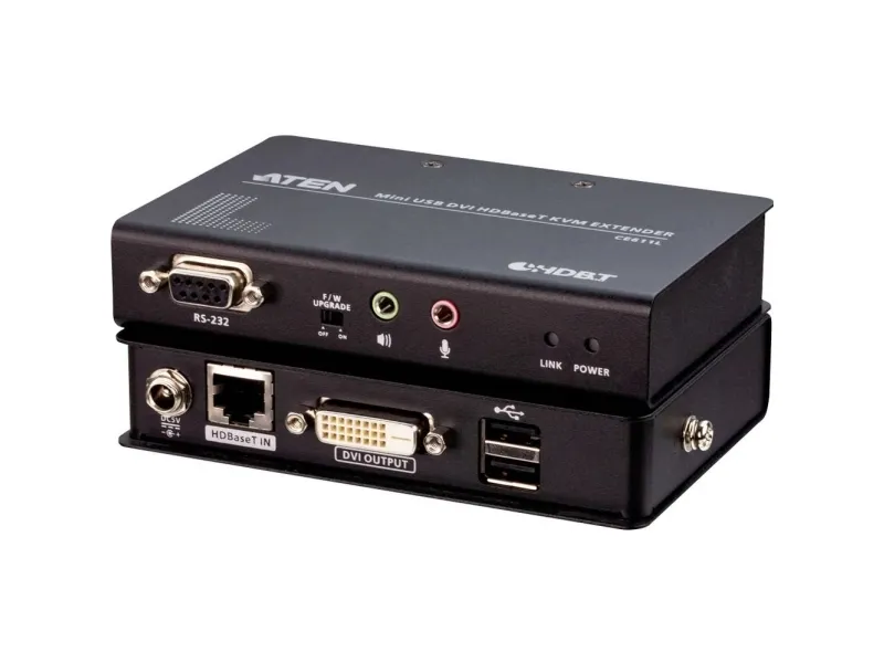 The ATEN CE611 is a USB DVI HDBaseT KVM Extender that integrates the latest HDBaseT technologies to transmit 1920 x 1200 DVI video, stereo audio, USB, and RS-232 signals up to 100 meters using a single Cat6 / 6a cable / ATEN 2L-2910 Cat 6 cable. This cost-effective extender comes with a small form factor design that includes DVI/audio interfaces, USB 2.0 full-speed ports, and serial console to fulfill most of extended KVM control and console demands. With an easy cable installation that supports various signals, the CE611 is ideal for applications where convenient remote access is required, such as transportation control centers, medical facilities, industrial warehouses, and extended workstations.