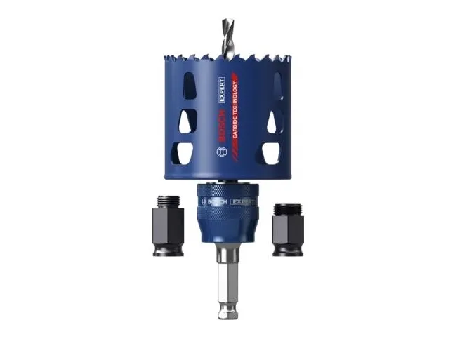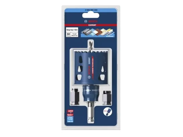 EXPERT Tough materiale hulsav-startsæt, 68 x 60 mmPower Change PlusHulsav med lang levetid og superhurtigt skiftesystem - de fleste hulsave til træ og metal ser ud til at fungere godt - til du kører på en hærdet søm eller en skrue. Et kort ryk, og nu mangler der et par tænder. Med sine Carbide-tænder bliver Expert Tough-materialet næsten ikke langsommere, når det rammer metal. Den trænger rent gennem materialet og skærer det pålideligt. Hver tand, der er fremstillet med Bosch Carbide Technology, har en optimal kvalitet af det hårdeste metal. Den bliver lasersvejset og slebet seks gange for at opnå den perfekte skæreform. Dette gør Bosch Expert Tough Materials hulsav ideal til svære opgaver og allround-arbejde: Ud over træ og metal kan hulsav også anvendes godt til rustfrit stål, mursten, bløde fliser og forstærket plast. Bosch Expert Tough Material hulsav er en fremragende allrounder til enhver håndværker - kun et halvt hul kan ingen bruge. Til brug med Power Change Plus-hurtigspænde