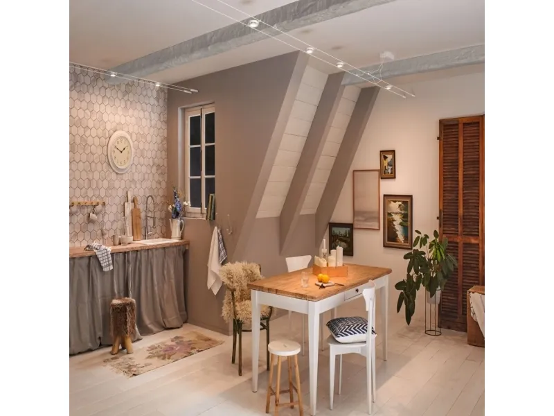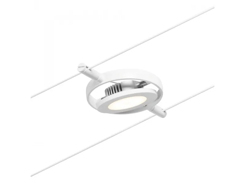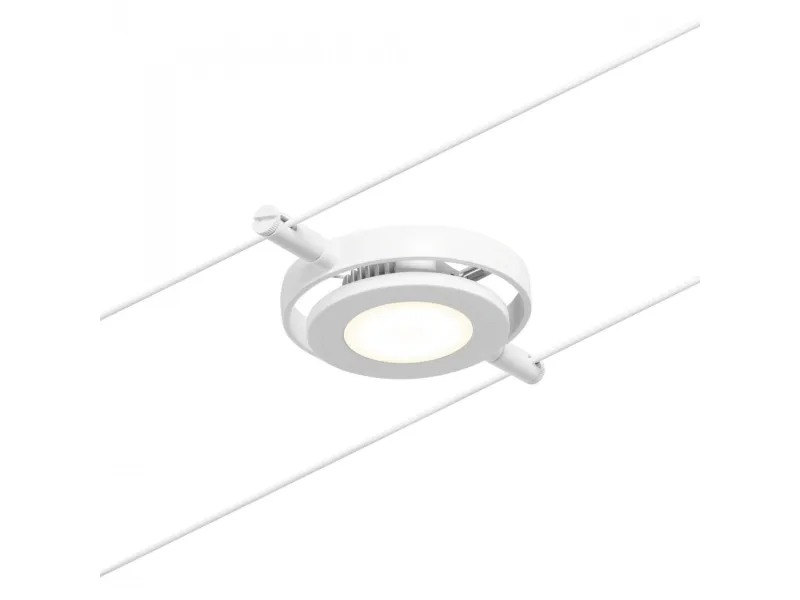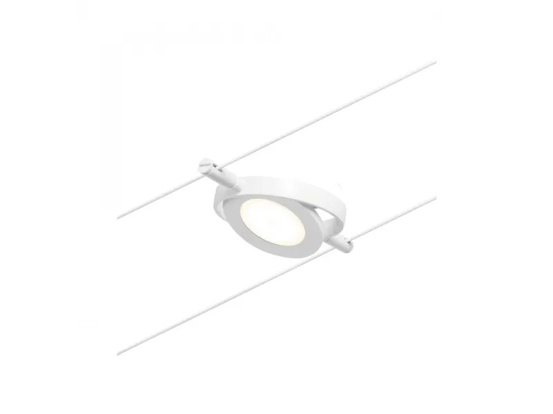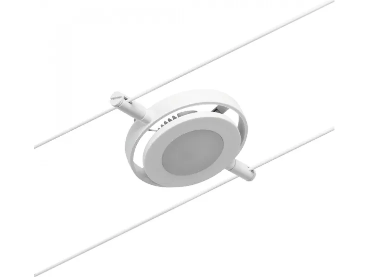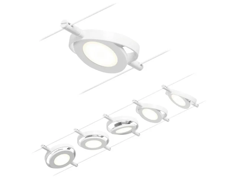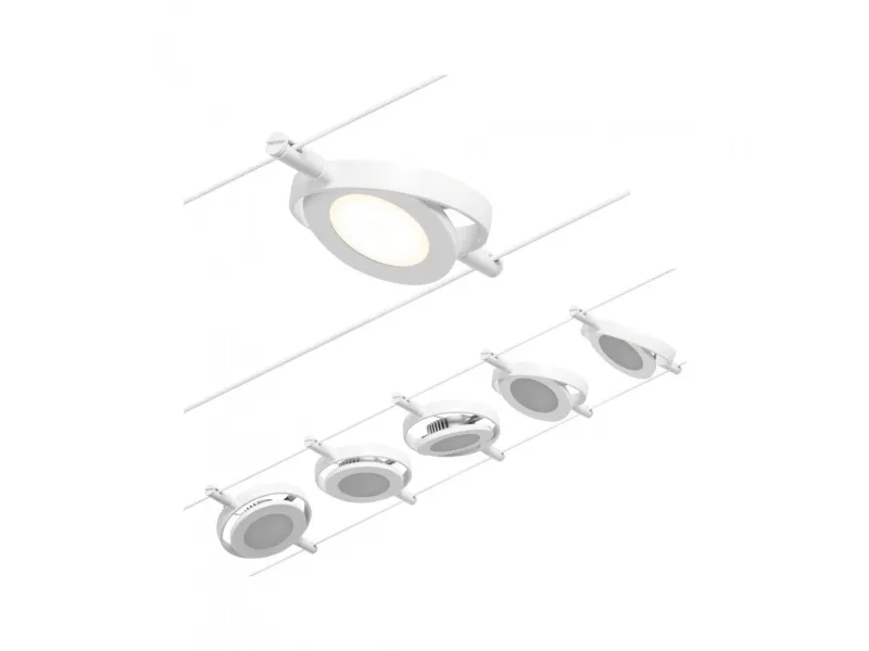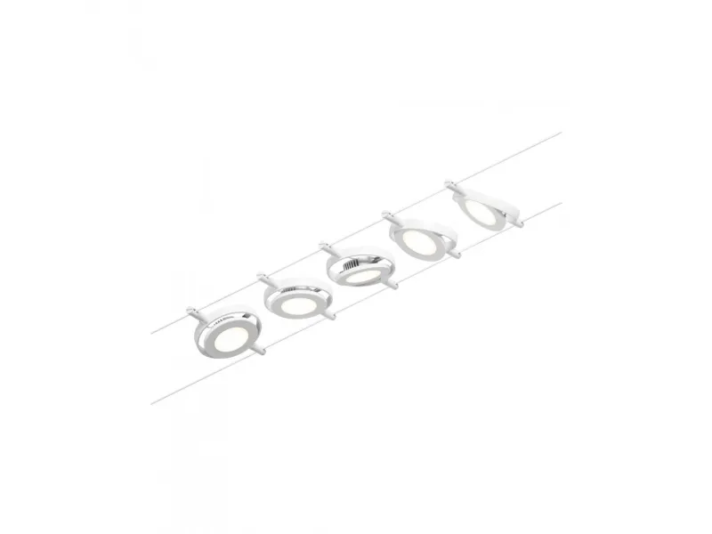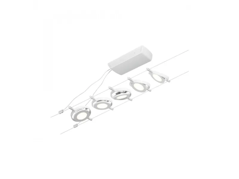 CorDuo LED Cable system RoundMac Basic Set 5x280lm 5x4,5W 3000K 230/12V White/Chrome The RoundMac series in White/Chrome can be installed on the wall or on the ceiling for unlimited design possibilities. Whether straight, sloped or angled – cable systems are suitable for any room and are the ideal problem solver for tricky installation conditions. The basic set can be supplemented with individual spots, deflectors and other accessories. The cable, with a length of 10 m, can be separated in the middle so the system can be suspended across a max. distance of 5 m. The system enables optimum light distribution, and can easily be expanded if more lighting is needed. Only one power outlet is needed for the distribution of luminaires throughout the room. Systems with 12 V DC (direct current) technology cannot be dimmed using a wall dimmer switch.