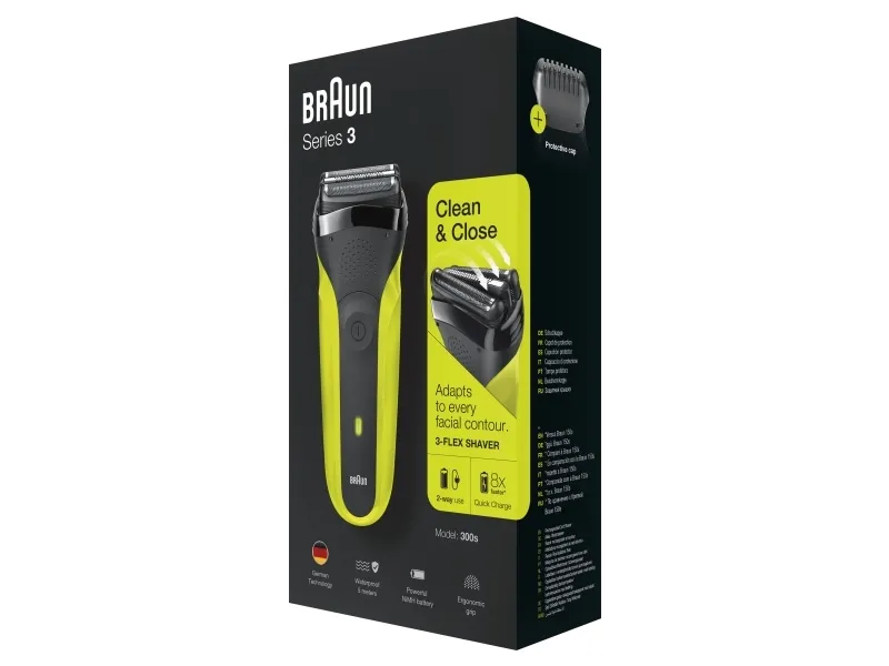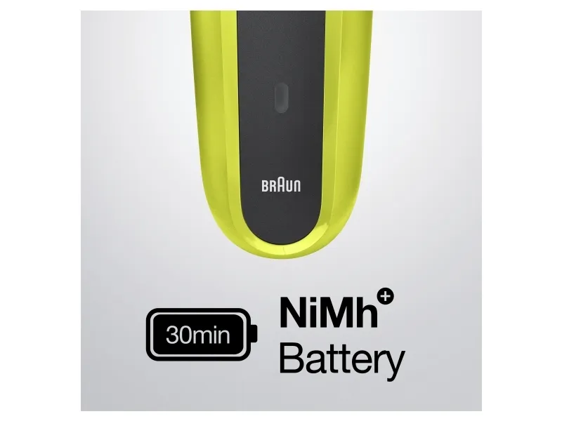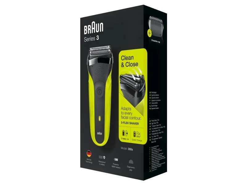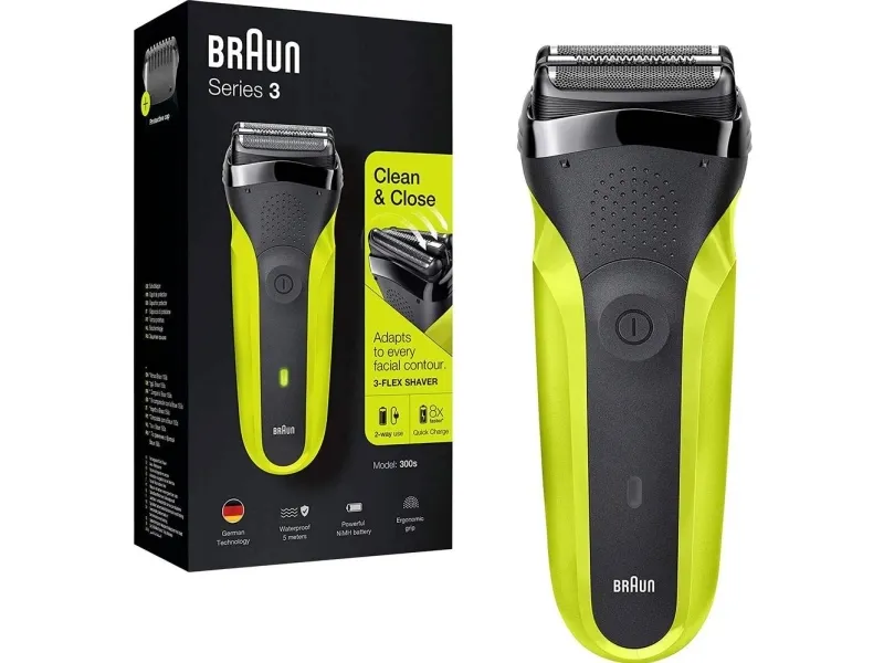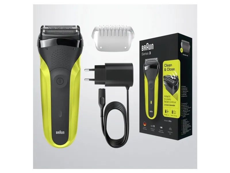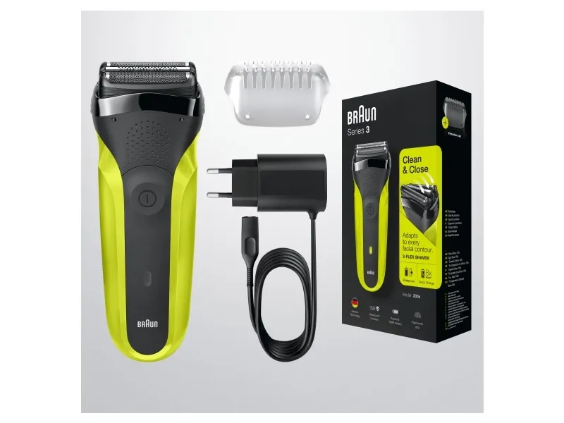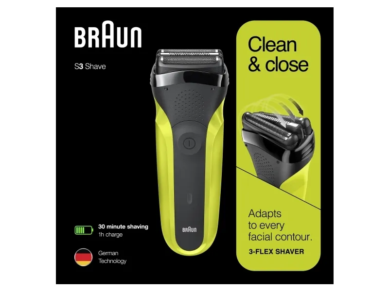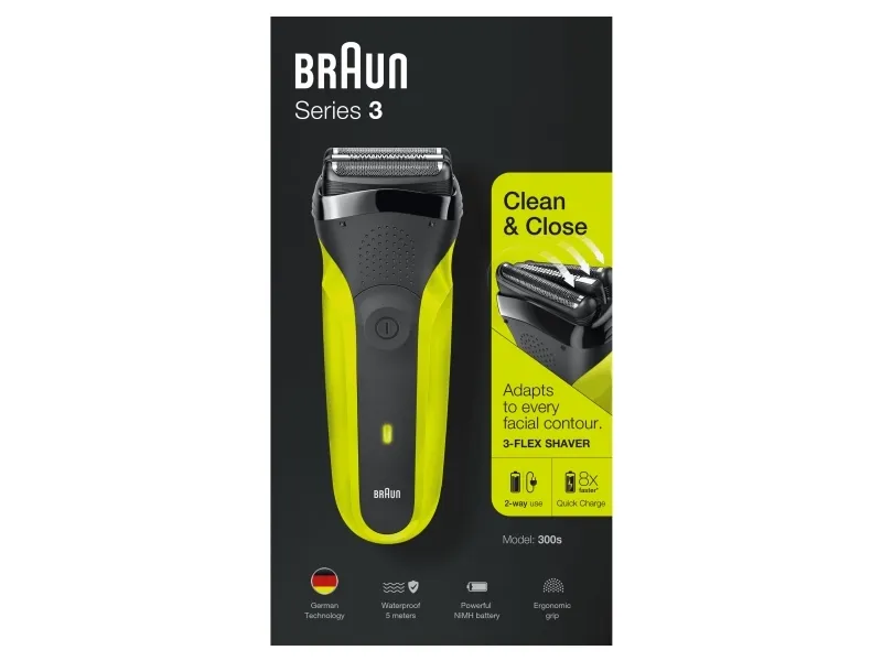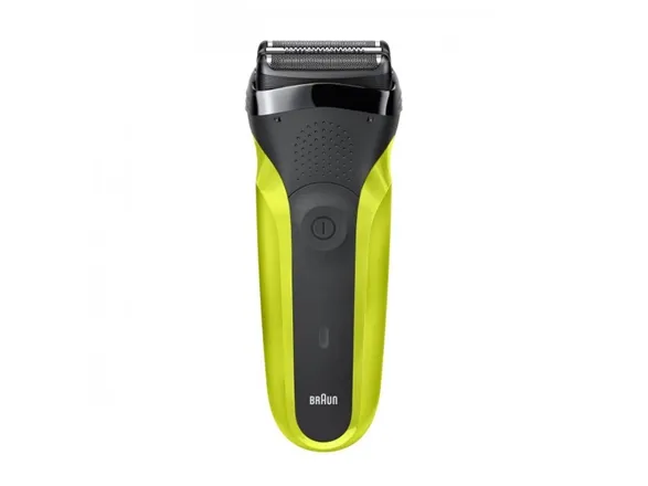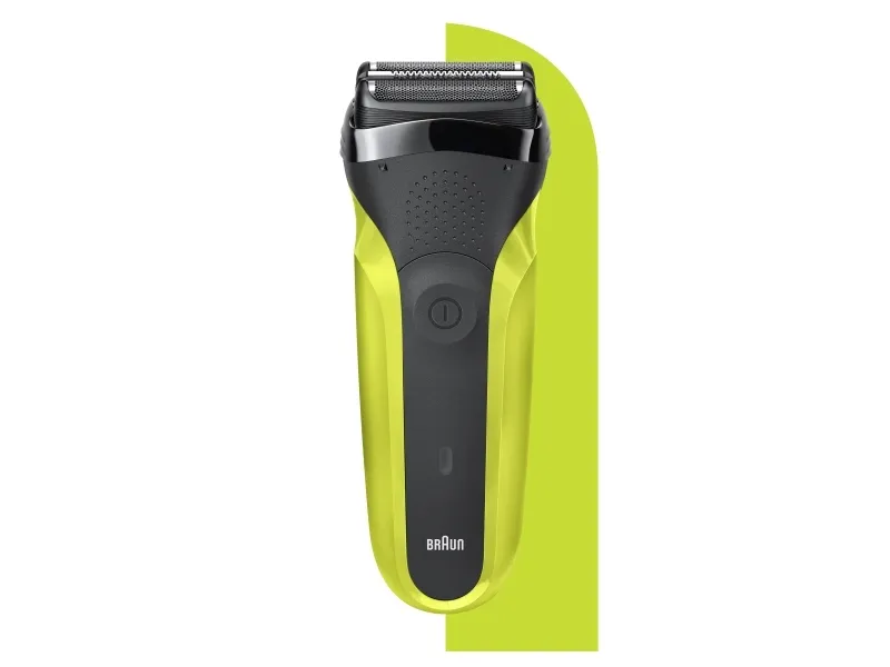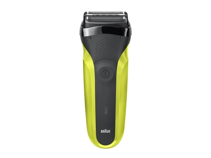 Braun Series 3 300 Electric Shaver, Razor for Men, Black/Volt Green. Shaver system: Foil shaver, Control type: Buttons. Product colour: Black, Green, Display type: LED, LED indicators: Charging, Power. Power source: AC/Battery, Battery technology: Nickel-Metal Hydride (NiMH), Battery type: Built-in battery. Weight: 326 g, Battery weight: 22 g. Package type: Box, Package width: 56 mm, Package depth: 111 mm