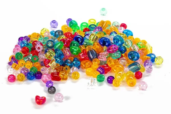 Muovihelmiä eri värejä, muotoja ja kokoja.