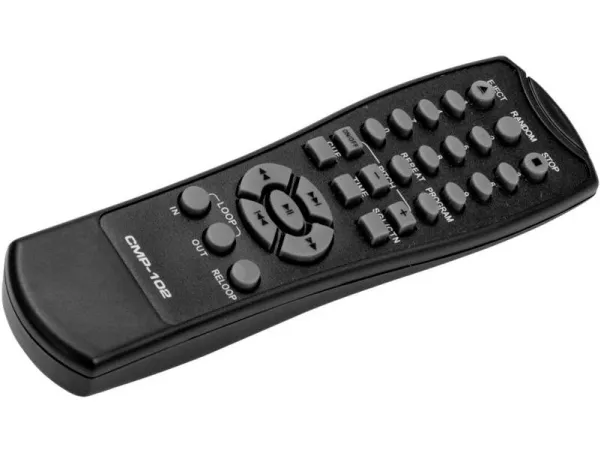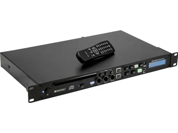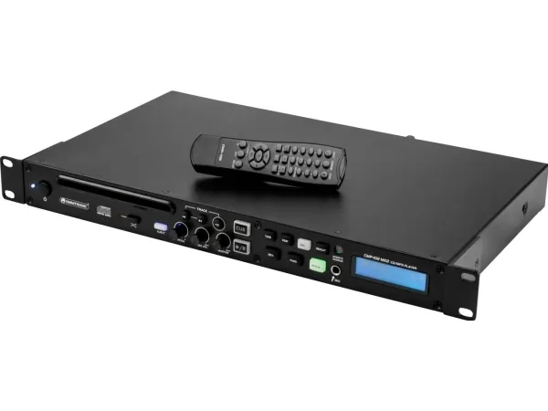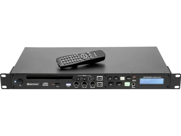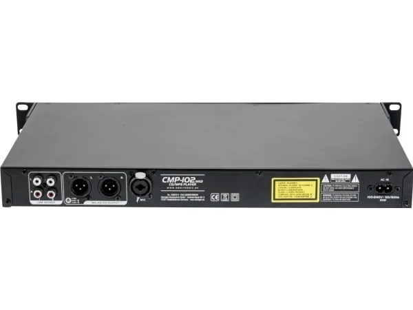 OMBITRONIC CMP-102 MK2 CD-/MP3-AFSPILLERSlot-in-drev · 40 sekunder anti-chok-buffer · regulerbar mikrofonindgang (jack og XLR) · master-udgang (XLR og phono) · Record-udgang (phono) · pitchregulering op til ±16 % · Cue-funktion · problemfri Loop- /Reloop-funktion (via fjernbetjening) · enkelt- eller samlet afspilning · tilfældig afspilning · gentagelsesfunktioner: REPEAT 1, Repeat All · titelprogrammering · bekvemt titelvalg med Skip-taster og +10-knap · alfanumerisk LCD-display (blåt baggrundsbelyst) · visning af titelafspilningstid, titelrestafspilningstid (MP3-CD) eller samlet afspilningstid (audio-CD) · visning af kunstner og titelnavn (MP3-CD) · søjlediagram (audio-cd) · visning af hastighedsændringen i % · rackindbygning (1 HE), rackvinkel kan tages af · kan styres via IR-fjernbetjening · (19) 48,3 cm rackmontering 1 HE. CD-/MP3-afspiller med 1 HE, XLR-tilslutninger og IR-fjernbetjening