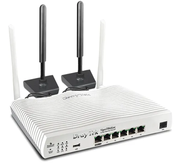 Draytek Vigor 2866L. WAN connection type: RJ-11. Wi-Fi band: Dual-band (2.4 GHz / 5 GHz), Top Wi-Fi standard: Wi-Fi 5 (802.11ac), WLAN data transfer rate (max): 867 Mbit/s. Ethernet LAN interface type: Gigabit Ethernet, Ethernet LAN data rates: 1000 Mbit/s, Cabling technology: 10/100/1000Base-T(X). Mobile network generation: 4G, 2G standards: GPRS, 4G standard: LTE. Security algorithms: HTTPS, IPSec, WPA2, WPA3