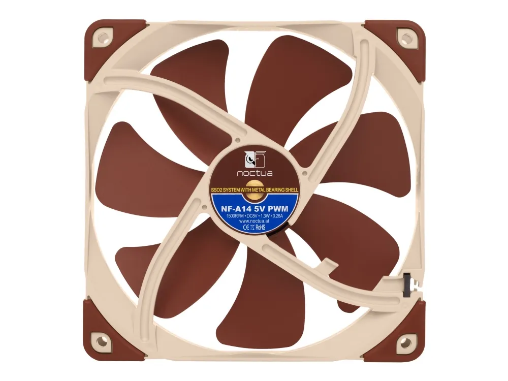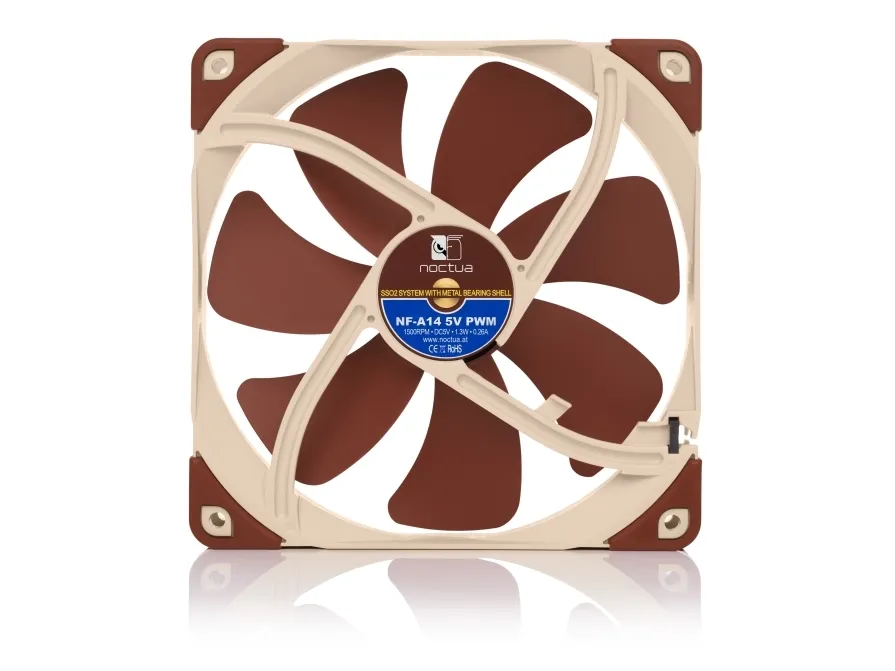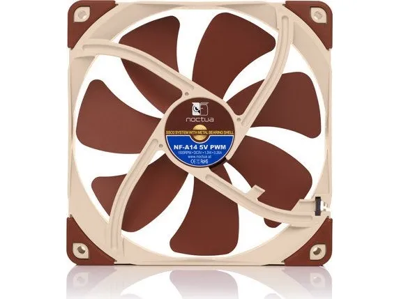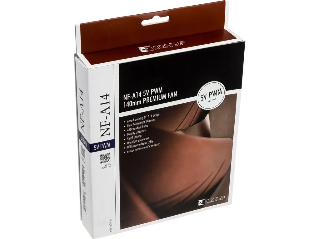 The NF-A14 5V PWM is a PWM-enabled 5V variant of Noctua's award-winning, premium-quality NF-A14 140mm fan. Featuring an AAO (Advanced Acoustic Optimization) standard frame and sophisticated aerodynamic design measures such as Flow Acceleration Channels, the NF-A14 is renowned for its superior performance and outstanding quietness of operation. Smooth Commutation Drive technology and Noctua's reference class SSO2 bearing guarantee superb running smoothness and excellent long-term stability.