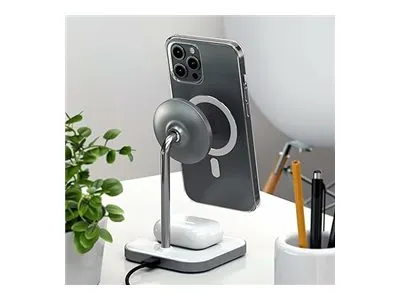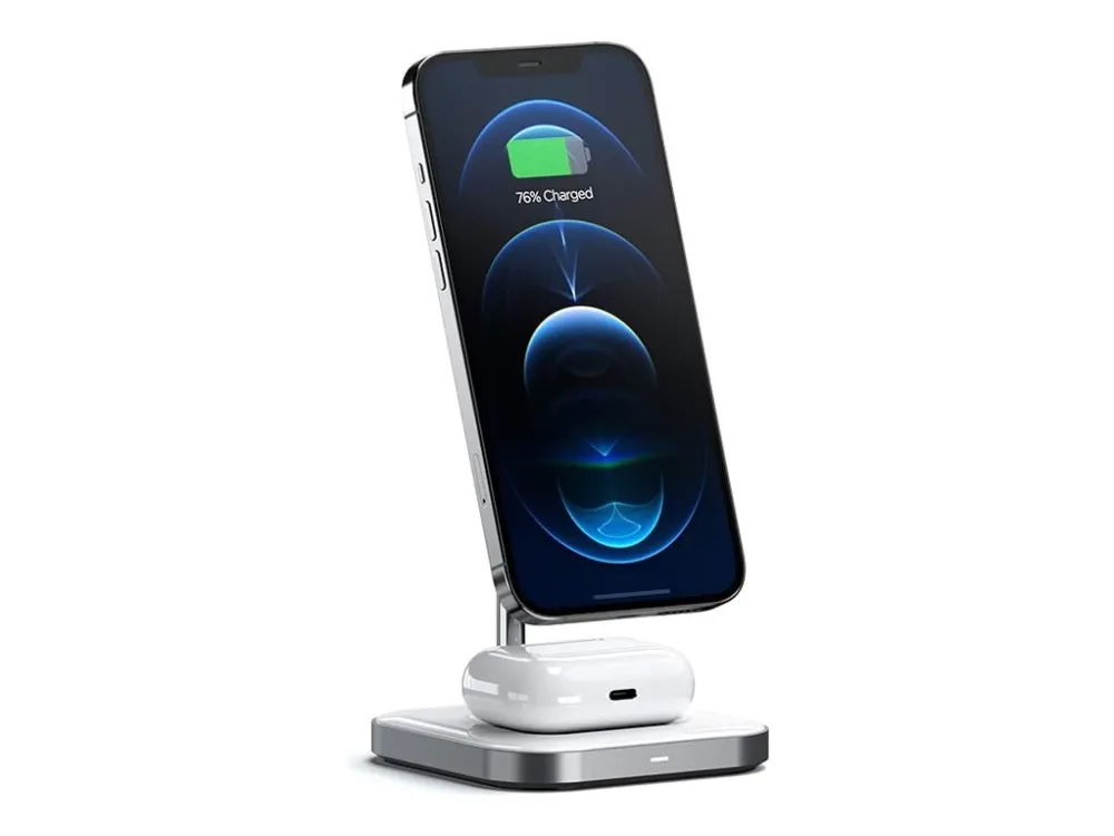 Satechi Magnetic 2-in-1 Wireless Charging Stand yhdistää langattoman kaksoislatauksen tehon ja kädet vapaan magneettikiinnityksen mukavuuden. iPhone 12/13:lle ja AirPods Prolle suunnitellussa jalustassa on sisäänrakennettu magneettilaturi ja siihen tarkoitettu langaton latausalusta, joka antaa virtaa molemmille laitteille helposti.