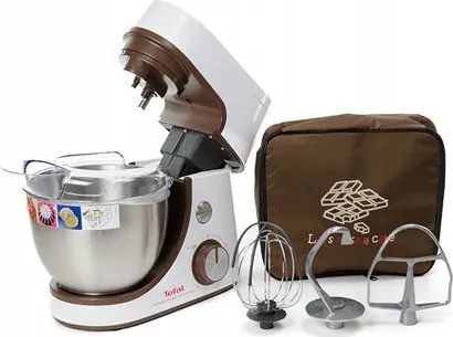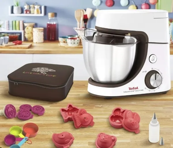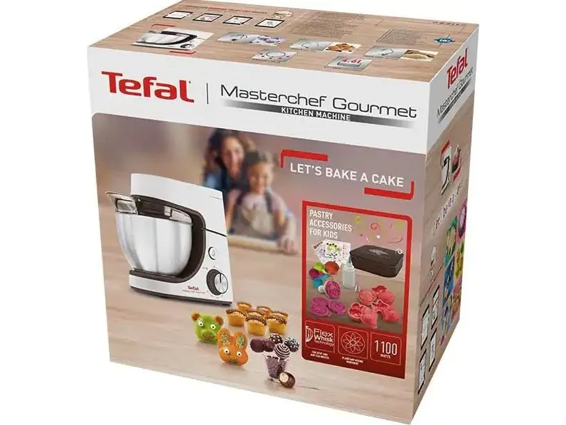 The Tefal Masterchef Gourmet Baking with Kids kitchen machine is designed to inspire creativity and fun in the kitchen. With a 4.6-liter stainless steel bowl, this versatile machine offers functionalities for kneading, mixing, and beating, accommodating a variety of recipes effortlessly. The tilting head feature allows for easy access to the bowl, making it convenient for users to add ingredients during food preparation. Included are essential attachments such as a dough hook, beater, and Flex Whisk, ensuring a comprehensive set for baking needs. A range of accessories, including a recipe book and themed kits for cookie stamps and animal shapes, enhances the baking experience, especially for families who love to create together. With a powerful 1100 W motor and user-friendly dial control, this kitchen machine is perfect for aspiring young bakers looking to explore new culinary adventures.
