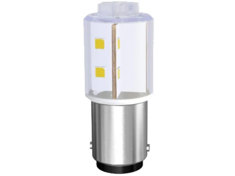 Led-lamppu Sistar® II. Pistorasia BA15d 12 V, 24 V AC/DC LED-lamppu , jossa on 8 sirullista LEDiä, segmentoitu On järjestetty 90°:n etäisyydelle. Homogeeninen valonjako voidaan saavuttaa 360°:ssa Pituus 20 mm. Iskun- ja tärinänkestävä. Yhdistetty kuusiokolo (SW10) ja poikkileikkaus Ruuvimeisseliä varten kotelon yläosassa. Mitat: Dia. 18,5 mm/pituus 45 mm Piirilevy: Varustettu 8 sirullisella LEDillä Pistorasia: BA15d TOIMINTAJÄNNITE 12/14V AC/DC 24 V AC/DC