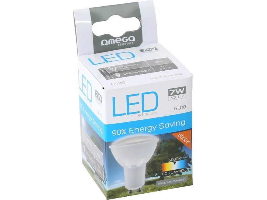 Omega OMELGU10-7W-6000, 7 W, GU10, 620 lm, 25000 h, Viileä valkoinen