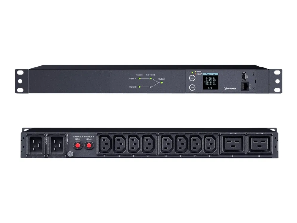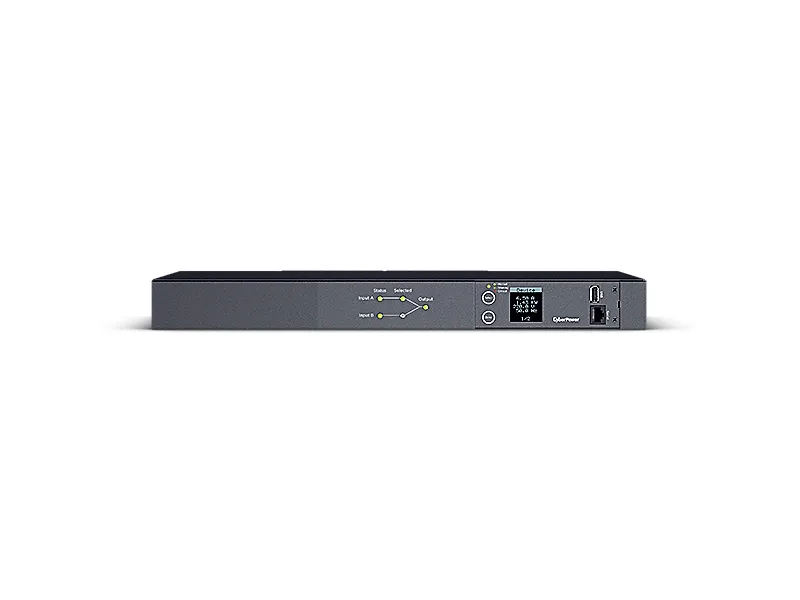 CyberPower PDU24005 provides output from a UPS unit, generator, or utility power to multiple connected devices in IT environments. Dual power cords can be plugged into separate power sources to provide redundancy to single-corded connected equipment. If the selected power source exceeds the desired thresholds or fails, the ATS PDU will automatically switch to the other power source to ensure continuous operation.