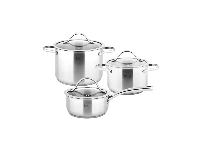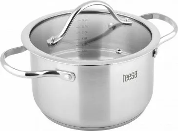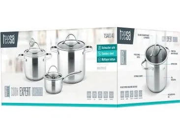 Ruostumattomasta teräksestä valmistetut kattilat Teesa COOK EXPERT MASTER Kiinteät ruostumattomasta teräksestä valmistetut pannut ovat minkä tahansa keittiön perusta. Siksi Teesa COOK EXPERT MASTER -pannusarja on valmistettu tätä ajatellen. Setti sisältää: ruostumattomasta teräksestä valmistetun kattilan, jonka tilavuus on 6 litraa ja 3 litraa, 1 litran kattilan ja kolme kantta, mikä on täydellinen setti, joka helpottaa erilaisten ruokien valmistamista. Profiloiduilla reunoilla varustettujen pannujen oikea rakenne helpottaa käyttöä ja eliminoi ruoan roiskumisen liedelle ja työtasoille.