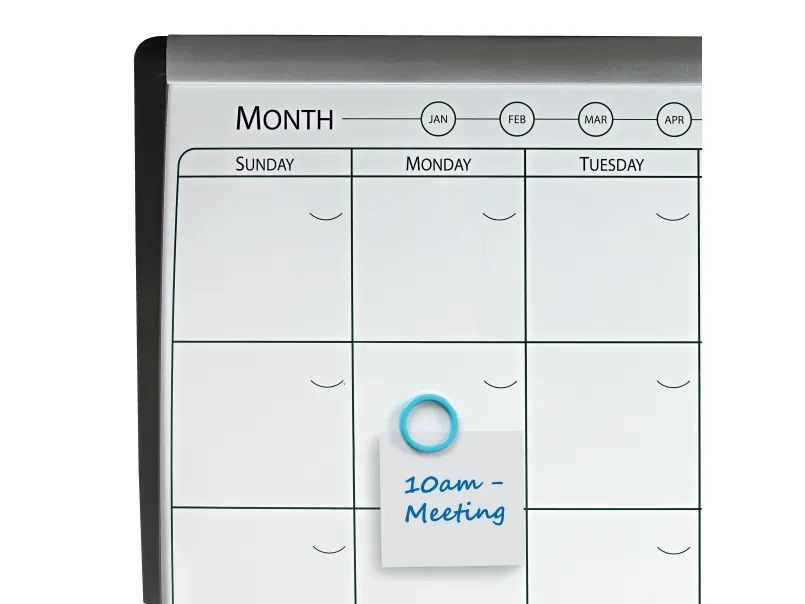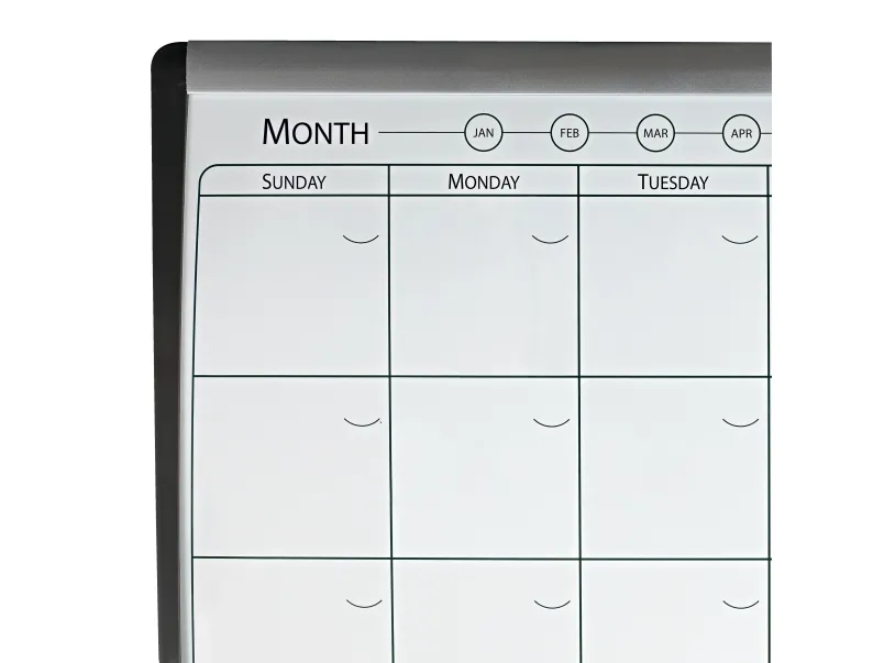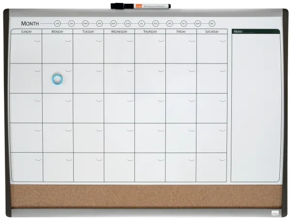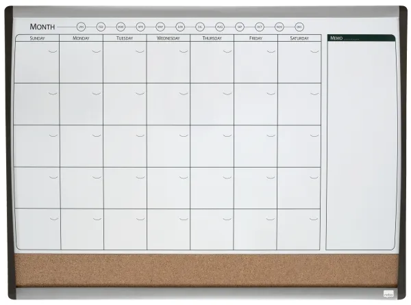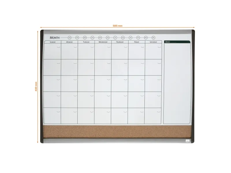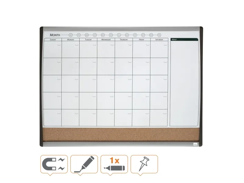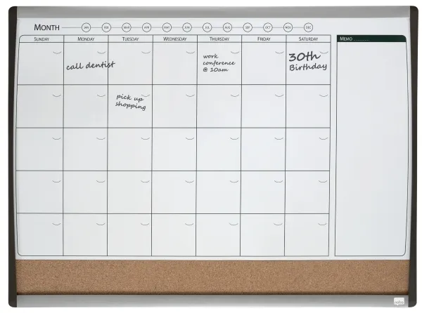 This Quartet calendar combination board features a magnetic dry-erase surface with calendar grid above a lower cork noticeboard section, both set within a distinctive black and silver arched frame, and is 585 mm x 430 mm in size.