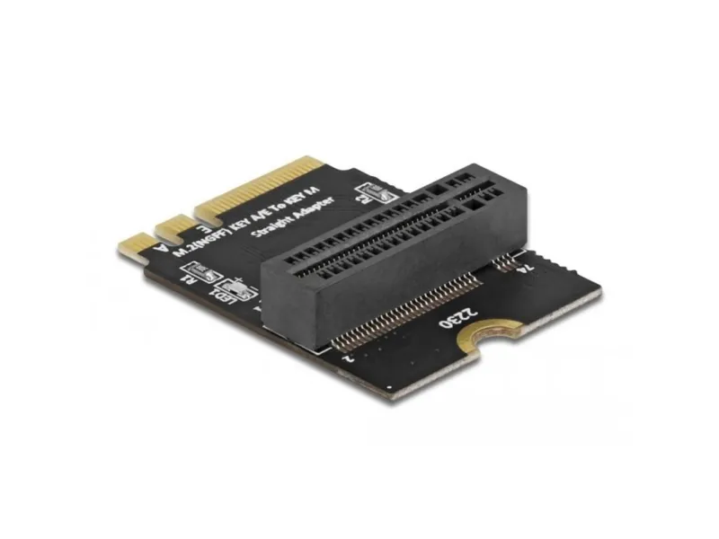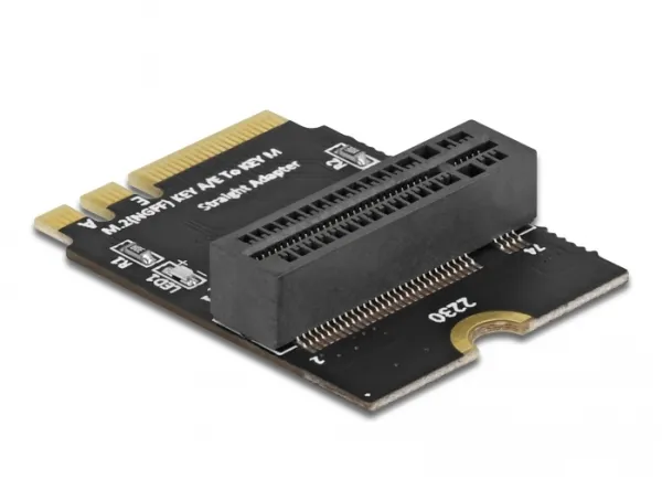 This adapter by Delock converts the M.2 key A or key E slot into a key M slot. An M.2 SSD can be connected vertically to this slot and fixed with the help of the holder.