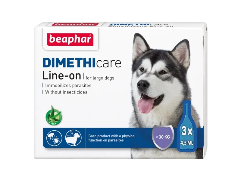 Beaphar Flea & Tick Line On (dimethicone) Large Dog yli 30 kg painaville koirille Voidaan käyttää 12 viikon iästä alkaen. Se kestää n. 3 päivää sen levittämisestä selkään, kunnes sillä on haluttu vaikutus. Koira on suojattu n. 10-14 päivää. Ravitsevien aloe veran ja dimetikonin yhdistelmä varmistaa, että punkit, täit ja kirput eivät pääse liikkumaan, kapseloitumaan eivätkä selviä hengissä. Ihanteellinen tuote tuholaisten torjuntaan. 100 % luonnollinen. Pääainesosa on luonnollinen silikoni, joka kietoutuu loisten ympärille ja estää niitä liikkumasta ja lopulta kuolemasta. Toinen pääaine on Aloe Vera. Sillä on ihoa ja turkkia pehmentävä ja ravitseva vaikutus. Se on ainesosa, joka tunnetaan myös parantavista ominaisuuksistaan.