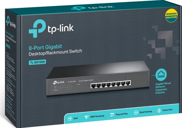 What This Product Does The TL-SG1008 8-Port Gigabit desktop/rack-mount switch provides an easy way to make the transition to Gigabit Ethernet. All 8 ports support auto MDI/MDIX, no need to worry about the cable type, simply plug and play. Moreover, with the innovative energy-efficient technology, the TL-SG1008 can save the power consumption, making it an eco-friendly solution for your business network.