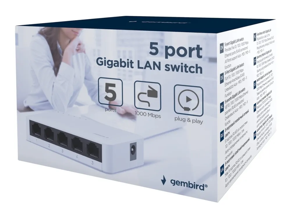 Kenmerken: 5-port Gigabit LAN switch Provides 5 10/100/1000 Mbps Ethernet ports (RJ45 connectors) All ports support full/half duplex modes and auto-negotiation All Ports support Auto-MDI/MDI-X function Power adapter included Specificaties: Standards: IEEE 802.3 10Base-T, IEEE 802.3u 100Base-TX, IEEE 802.3ab 1000Base-T, IEEE 802.3x Cabling: UTP Cat.3 or up for 10BASE-T; UTP Cat.5 or up 100BASE-TX/1000Base-T Power consumption: 5 V DC up to 1 A Dimensions: 83 x 49 x 21 mm Net weight: 49 g Operating temperature: 0 ~ 40 °C Storage temperature: -40 ~ 70 °C Operating humidity: 10 ~ 90 %RH (non-condensing) Storage humidity: 5 ~ 90% RH (non-condensing) Inhoud: Gigabit LAN switch Power adapter