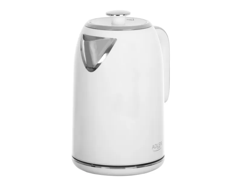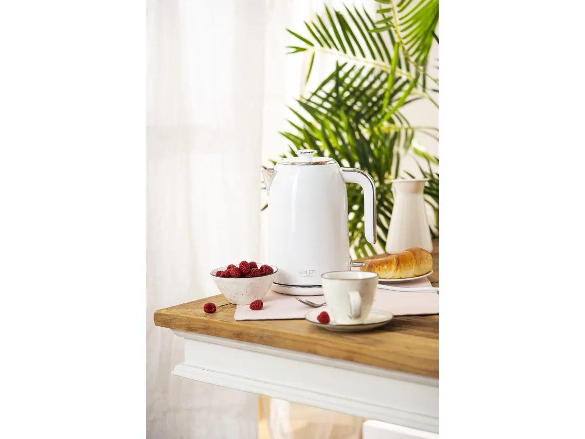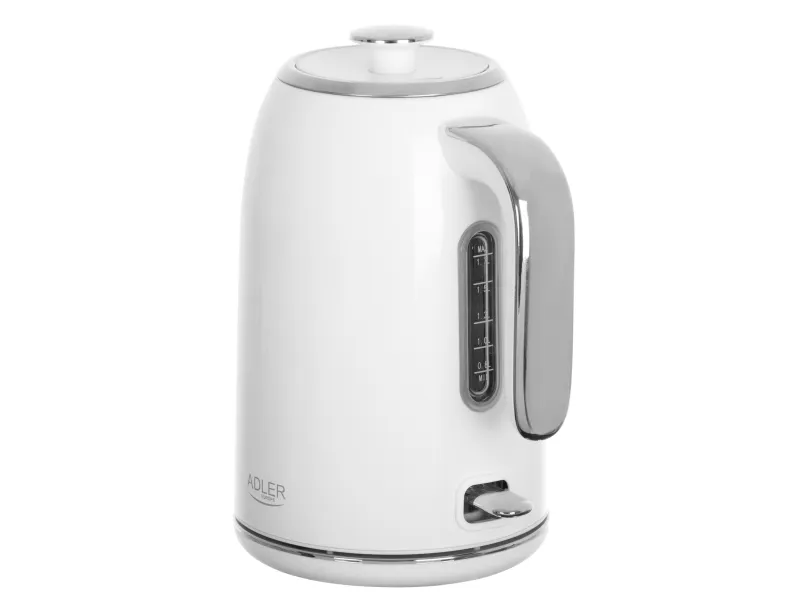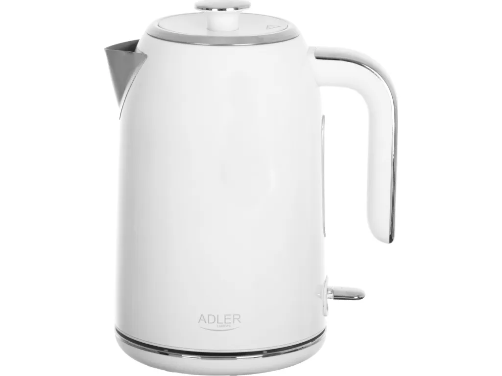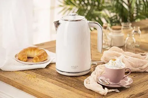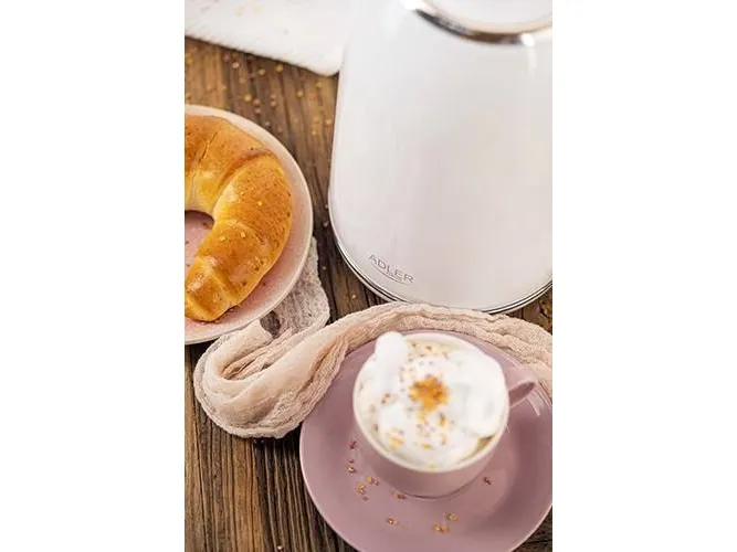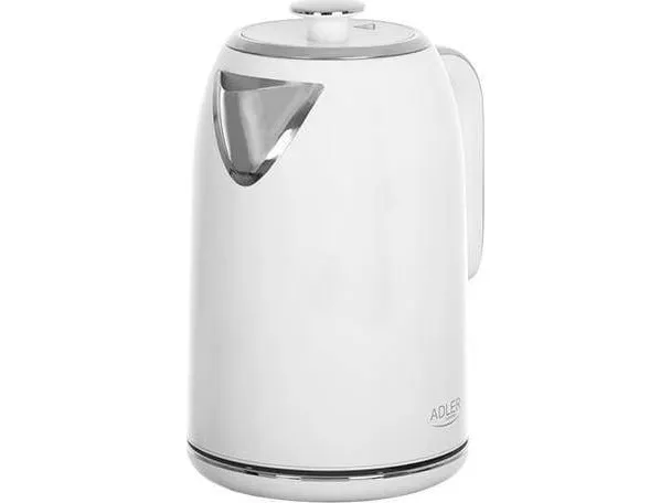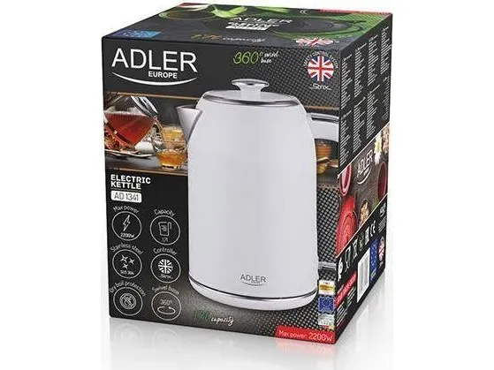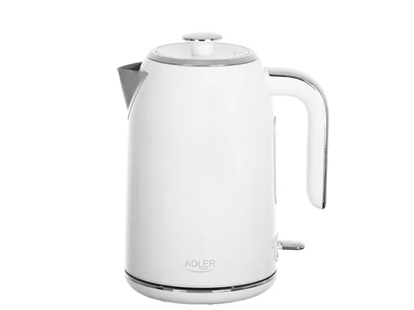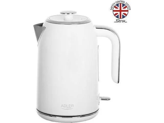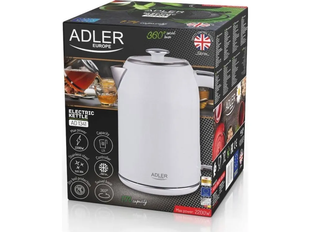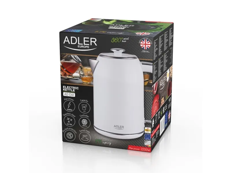 A modern 1.7-liter electric kettle, useful in every kitchen. Its safety is ensured by a lock that prevents turning on an empty kettle, and automatic shutdown after boiling water, and the STRIX safety control system. The functionality is increased by a stable base and a clear water level indicator. It has a maximum power of 2200W and is made of stainless steel, which makes it a master solution when it comes to quickly boiling water. The appliance is equipped with a protection against boiling without water.Adler AD 1341. Water tank capacity: 1.7 L. Power: 2200 W. Product colour: White, Housing material: Stainless steel, Adjustable thermostat, Water level indicator, Overheat protection. Cordless