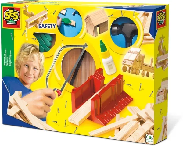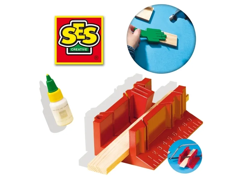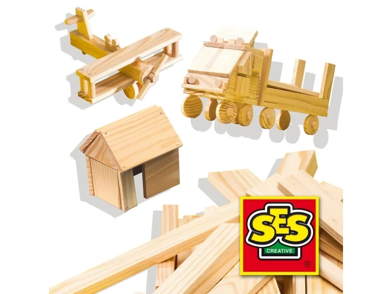 SES products inspire you to make the most beautiful creations. As well as hammering, this carpentry kit also teaches you to saw the wooden pieces to the correct size. Use the various wooden shapes to design whatever you wish.