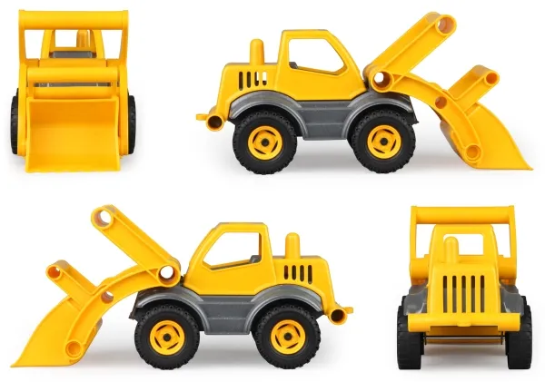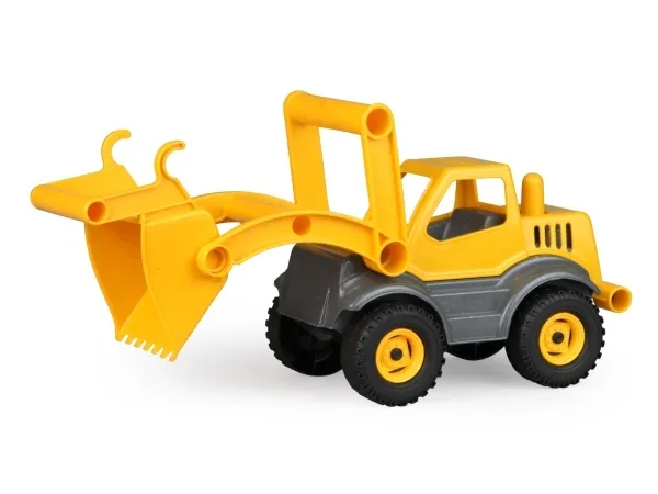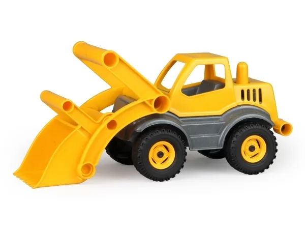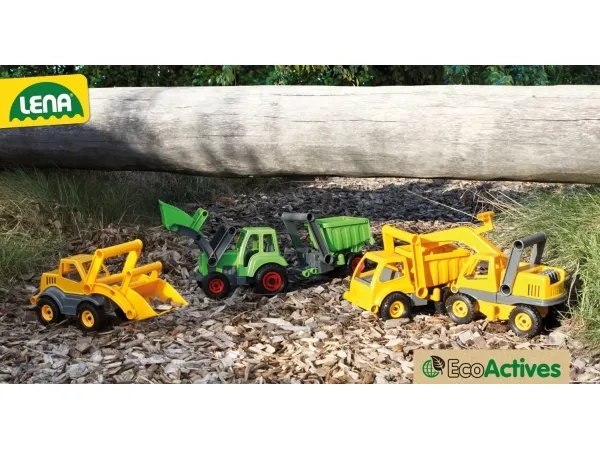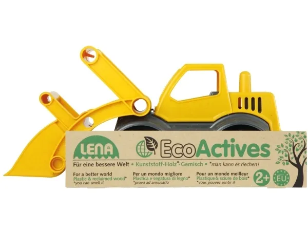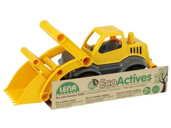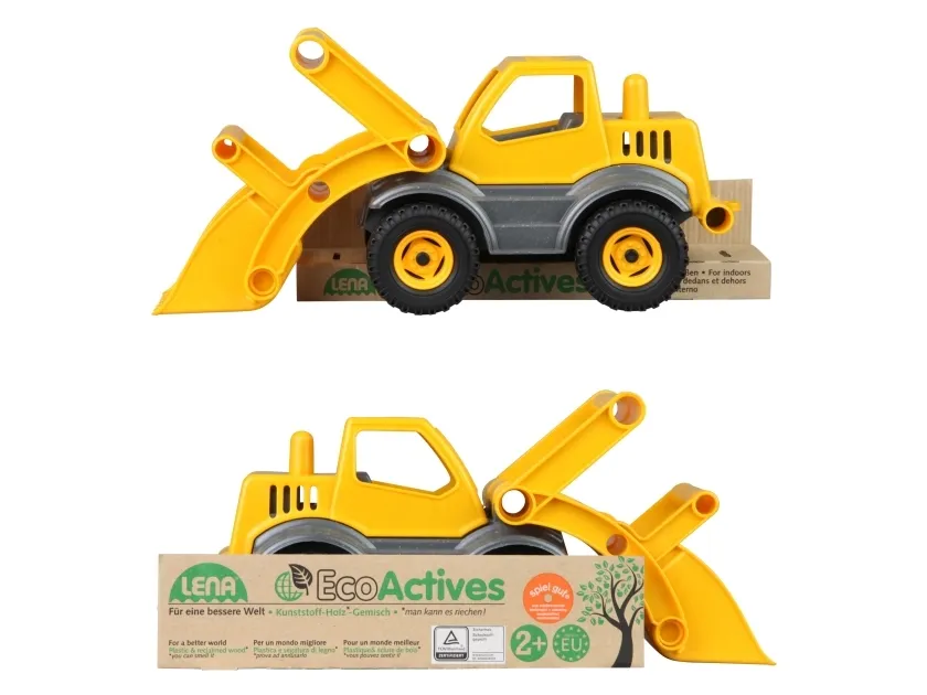 LENA® EcoActives Earth mover out of a plastic-wood-compound withwooden smell, galvanised steel axles, lockable shovel.