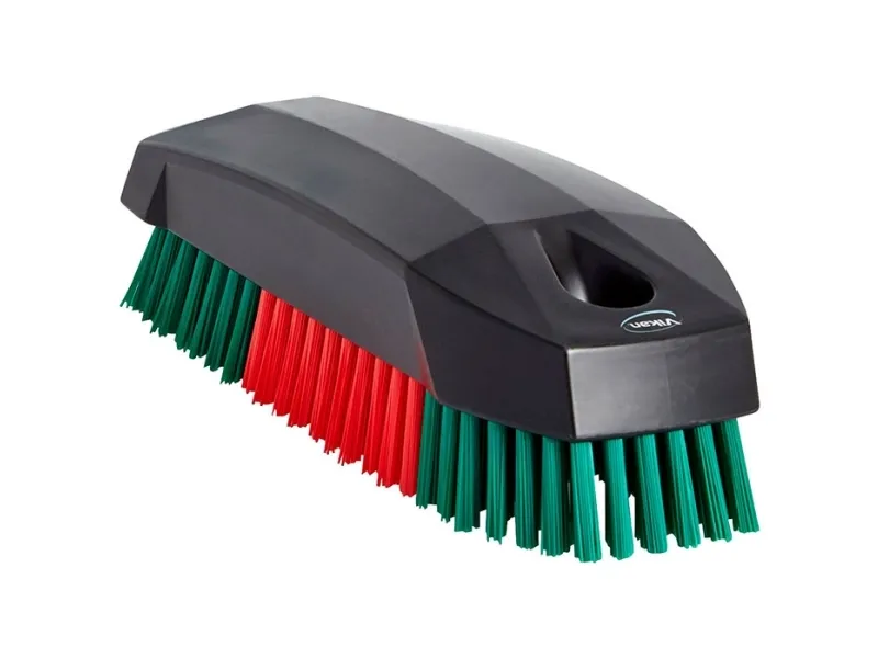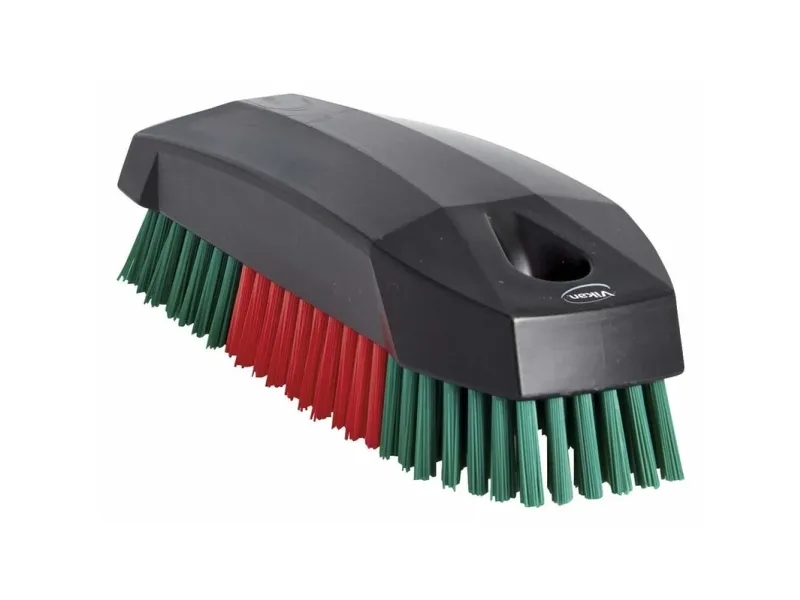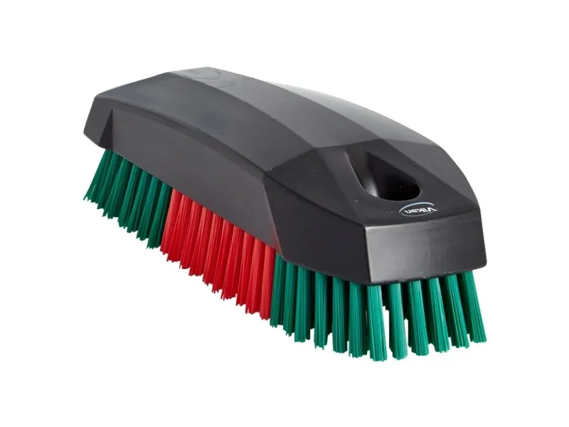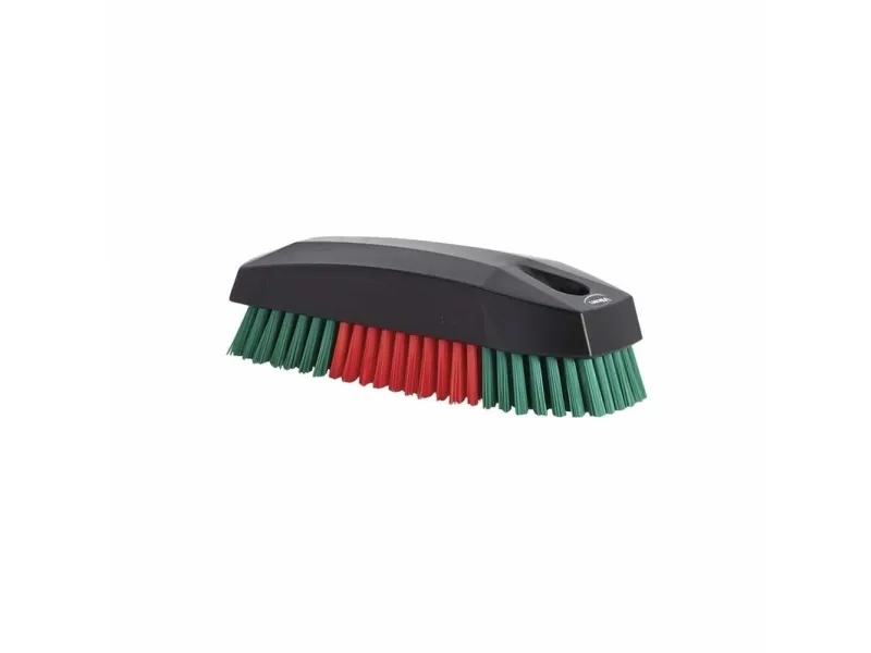 Neglebørste udført i sort polypropylen med stive røde/grønne filamenter. Denne neglebørste er væsentlige større en almindelige neglebørster på markedet og derfor god at have på værksteder og andre steder, hvor grundig rengøring kan være påkrævet. Neglebørsten er lavet med solide filamenter, der kan tåle agressive kemikalier og høje temperaturer.