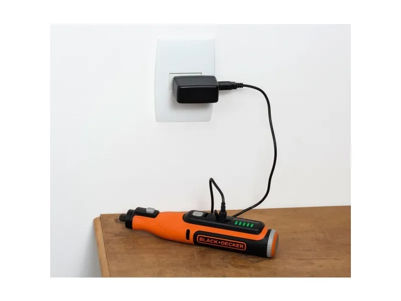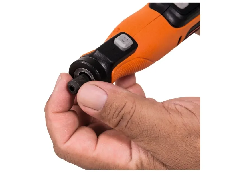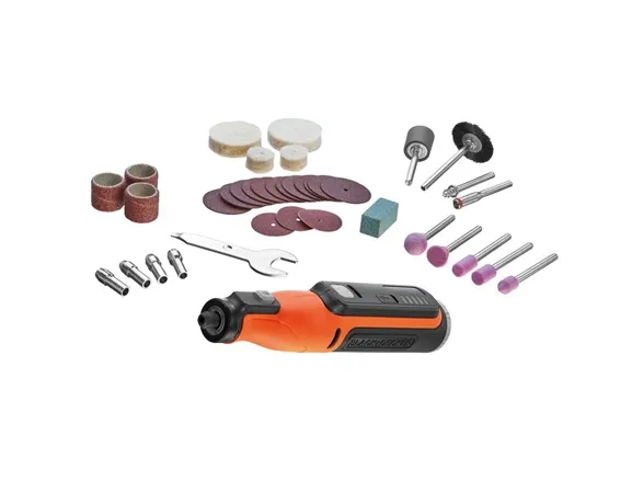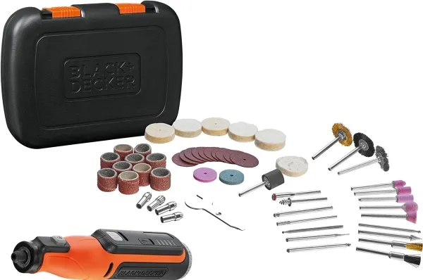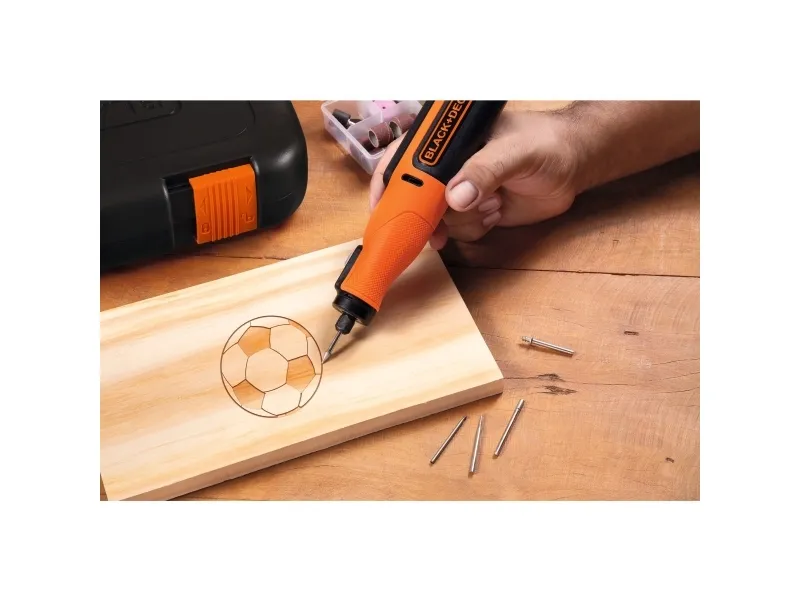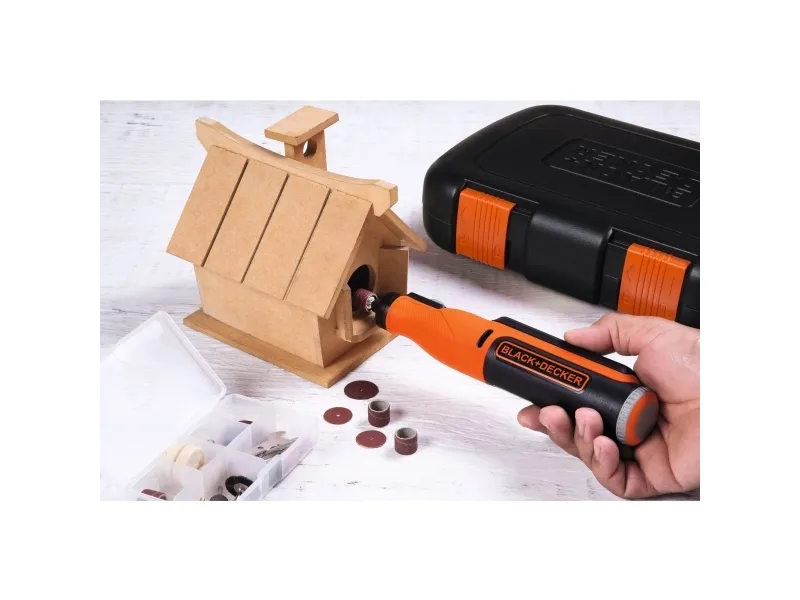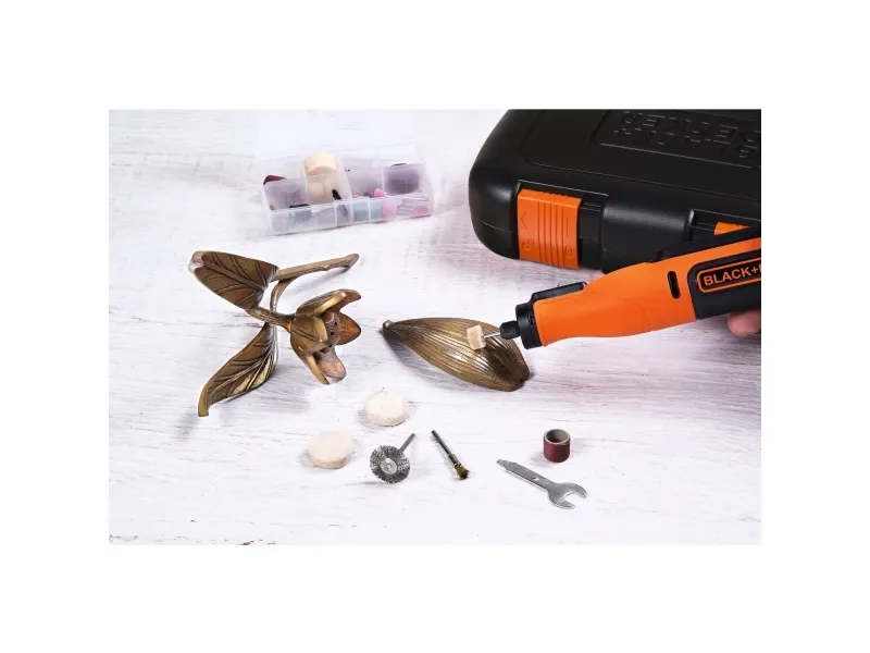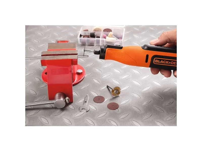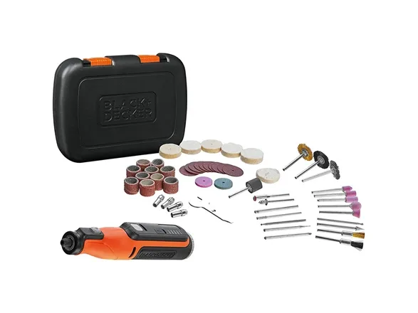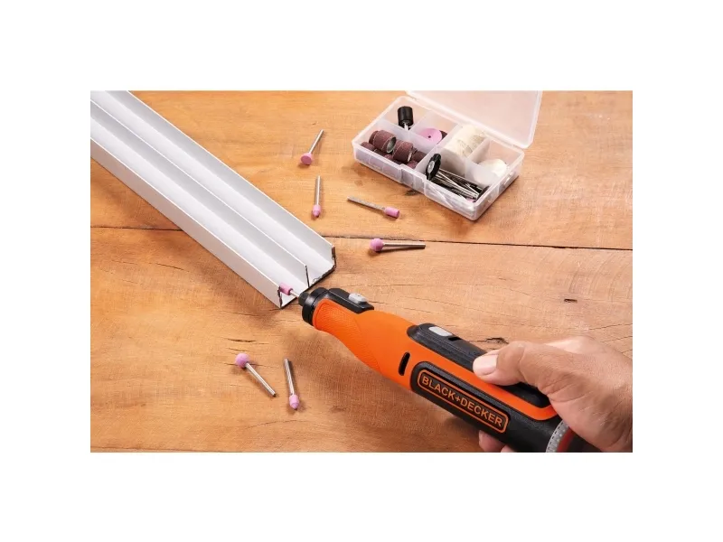 The BLACK+DECKER BCRT8IK-XJ rotary tool combines portability with performance, designed to meet the needs of DIY enthusiasts and professionals. This cordless tool is powered by a 7.2 V battery, making it suitable for a wide range of applications without the limitation of a power cord. It features an LED light and an LED speed indicator, ensuring that users have both visibility and control over their work. The convenience of micro USB charging allows for easy recharging from various sources, while the 5-speed transmission provides flexibility across different materials and tasks. Packaged in a durable Kitbox, this rotary tool is ready to tackle any project with precision and ease.