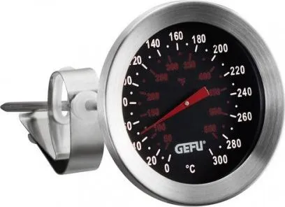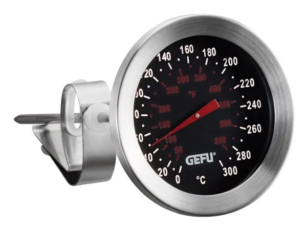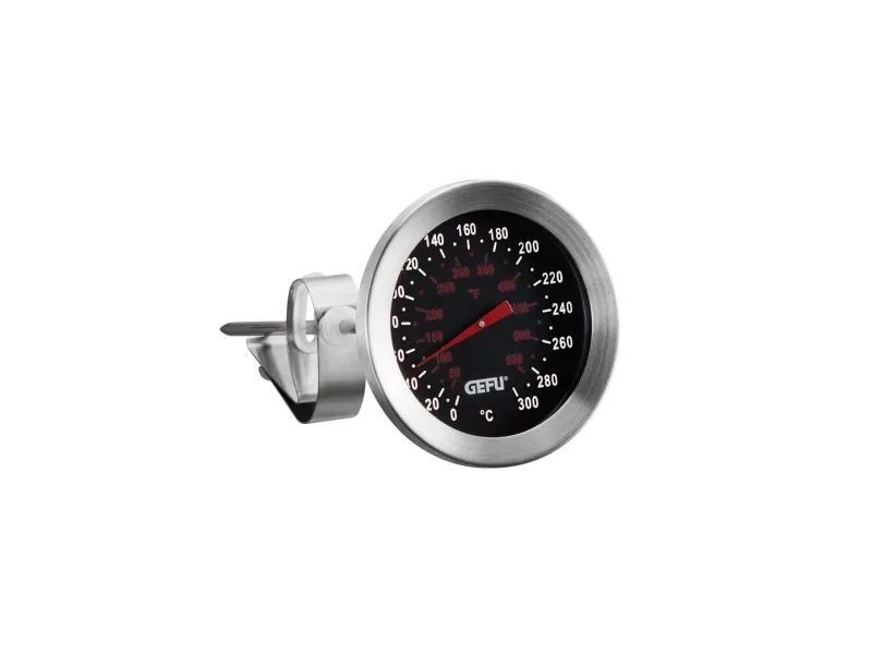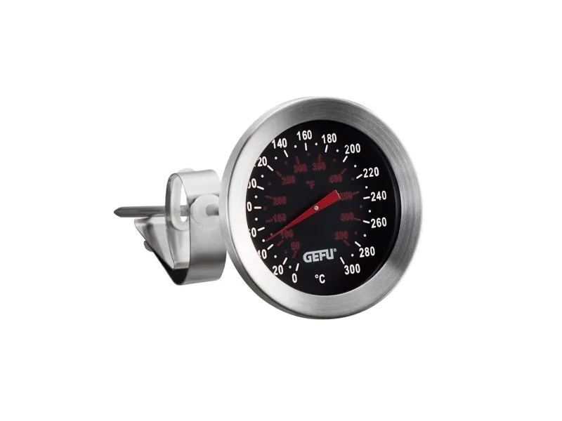 The perfectly done roast, the best temperature for melting coating chocolate, the ideal temperature for deep-frying oil: this cooking thermometer provides the required degrees in Celsius and Fahrenheit. Thanks to a practical clamp, the thermometer is easily attached to the rim of the pot.GEFU SIDO. Height: 140 mm, Weight: 45 g. Quantity per pack: 1 pc(s)