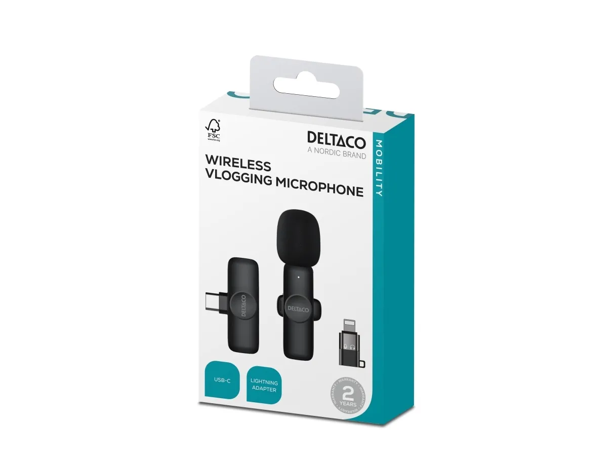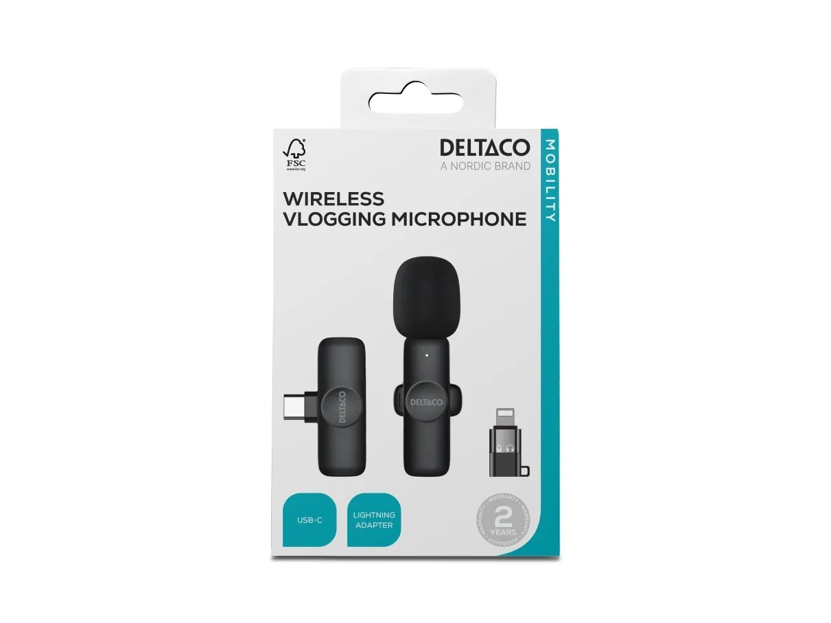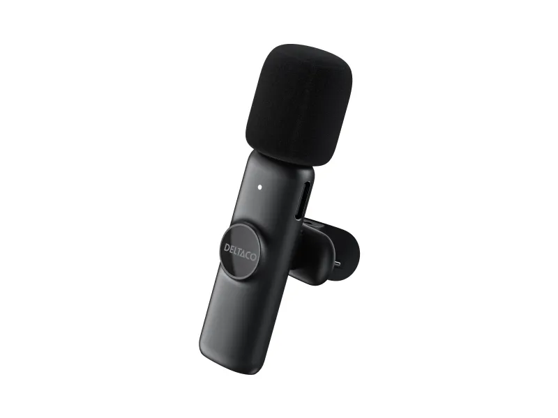 The DELTACO VLOG-100 is designed for those capturing audio on-the-go, featuring a wireless lavalier microphone system for voice recording, vlogging, and more. Its clip-on design ensures ease of use and mobility, allowing users to focus on their content without being hindered by wires. The microphone is equipped with a rechargeable battery, providing convenience during long recording sessions. The built-in LED indicator and mute control enhance functionality for various applications.
