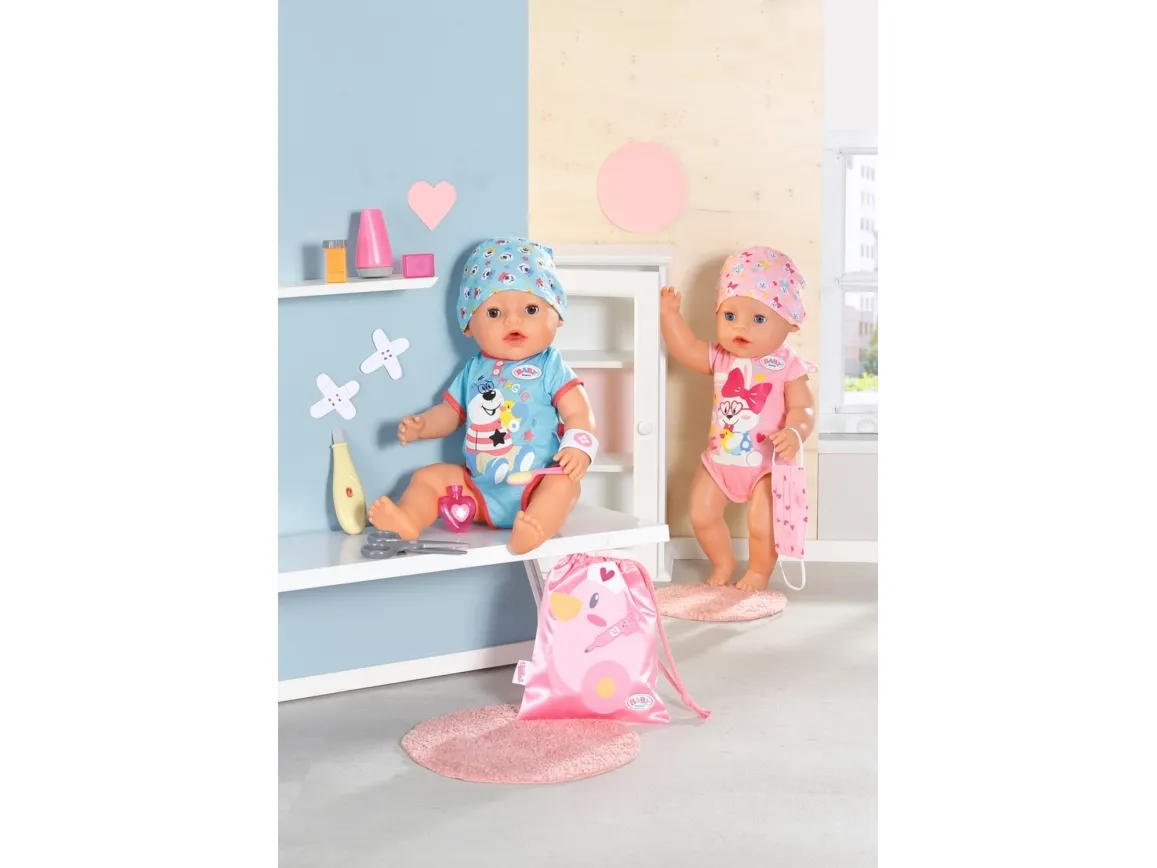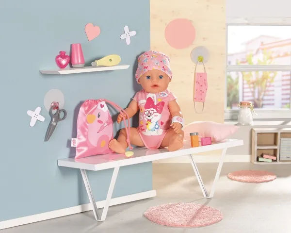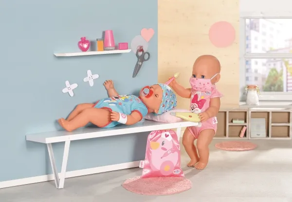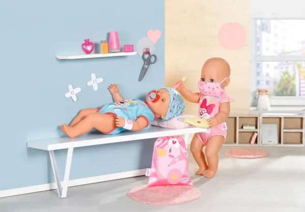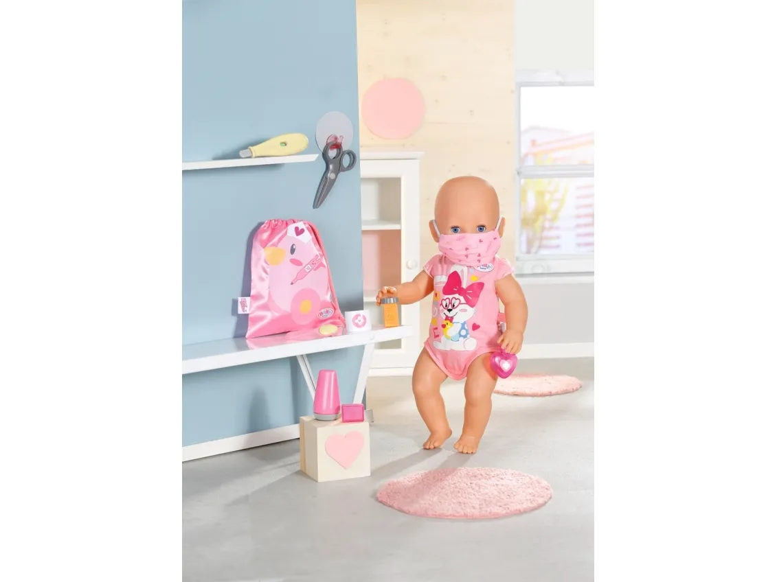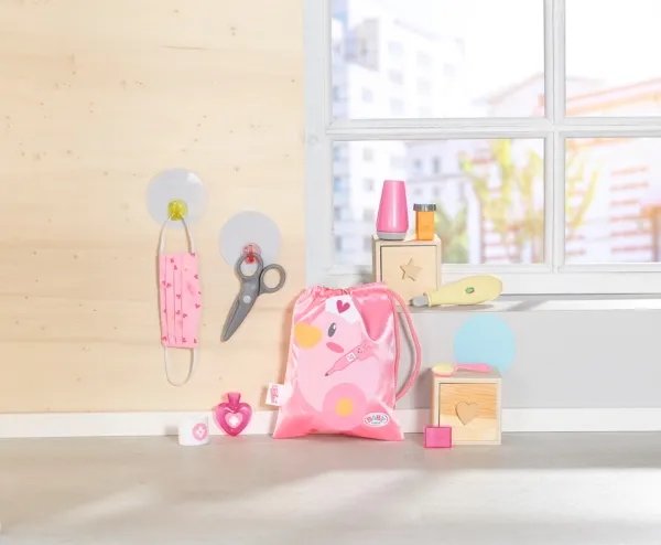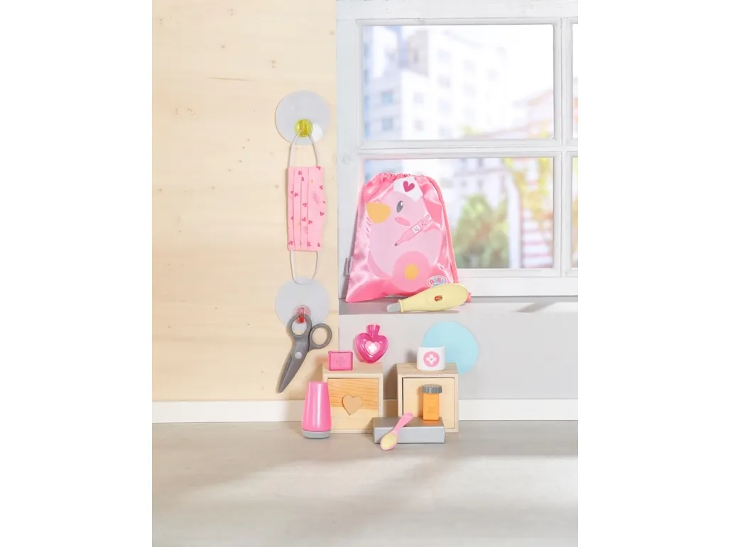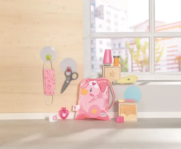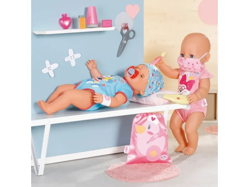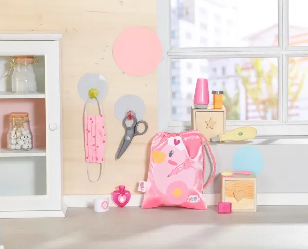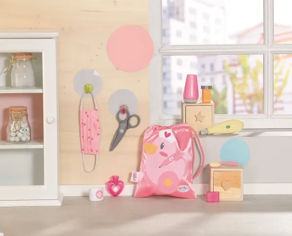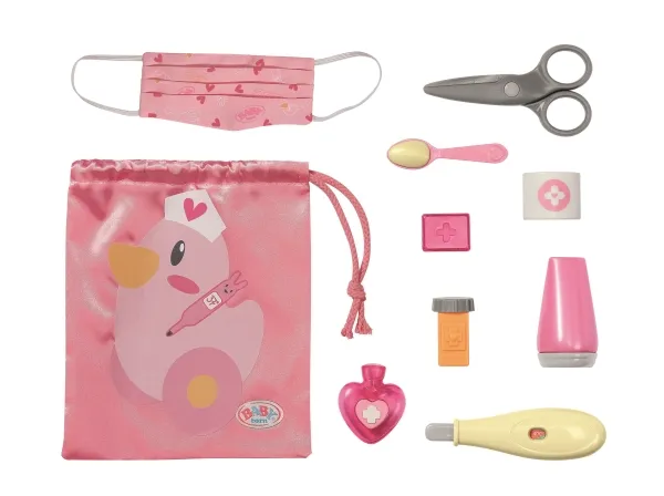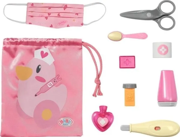BABY born ensiaputarvikesetti Hyvällä hoidolla BABY born nukke paranee pian. Setti sisältää erilaisia nuken ensiapu- ja hoitotarvikkeita, esim. kuumemittari, kasvomaski ja lääke- ja voiderasiat. Mukana säilytyspussi tarvikkeille.