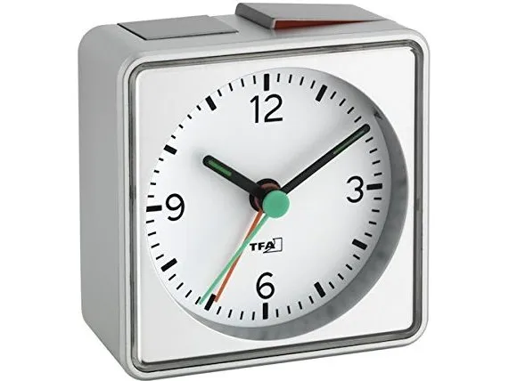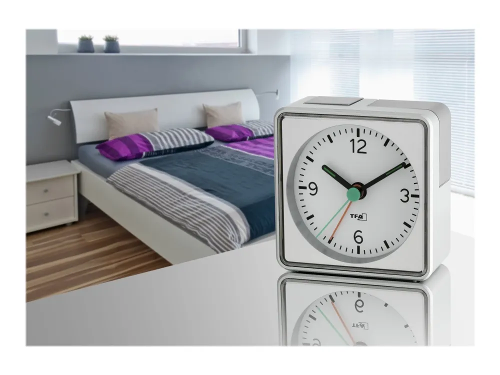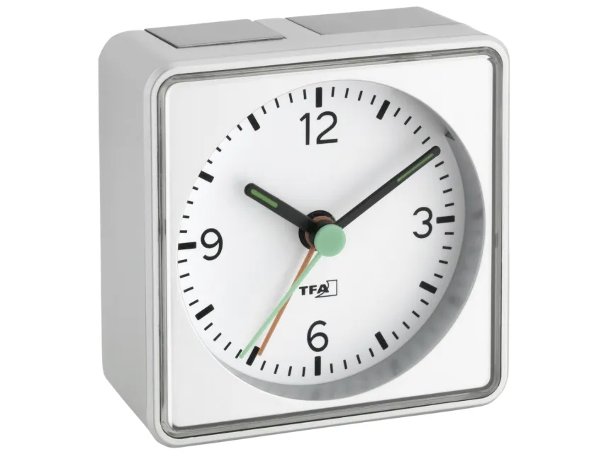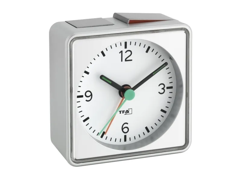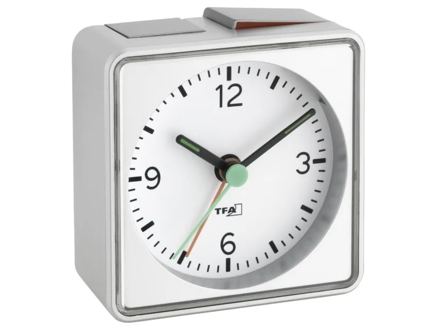 The practical PUSH alarm clock from TFA runs almost silently thanks to its sweep movement, so it does not disturb your sleep. The colour-coded rocker switch shows at a glance whether the alarm is activated or not. For a pleasant waking up, the alarm starts softly and then it gets louder and louder. And if you do not want to get up right away, the snooze function lets you wake up a few minutes later. To ensure that you can read the time well at night, the display is illuminated by pressing a button.