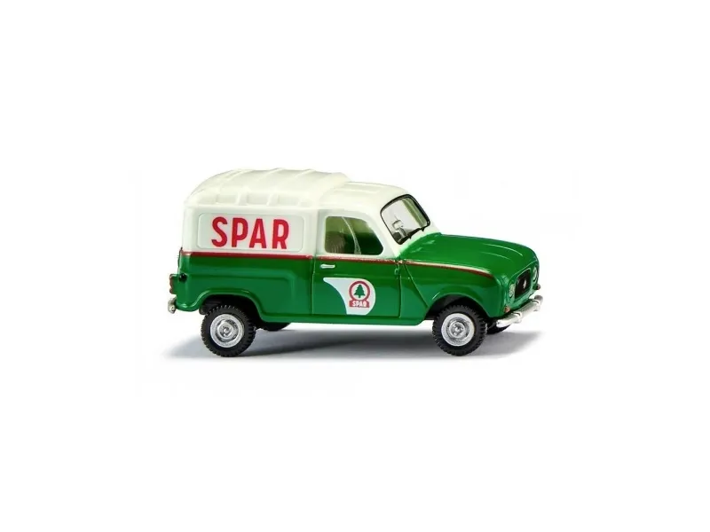 H0 Renault R4 kassevogn SpareTransportmirakel fra det store marked på vej mod besparelserHvad was mere, når man som forhandler ønsker at transportere en masse varer fra engrosmarkedet til indladning? R4 med sin mægtige kasseopbygning gør det muligt som ingen anden bil fra disse år. Allerede i 1960'erne gav franskmanden et godt ry og var i brug i de daværende sparelag. Den markante tofarvede hvid-grøn-udformning med sparelogoet på døren gør Renault-modellen til en modelbygningsbaseret tideuge. Kufferten på 1:87-miniature kan åbnes på kufferttaget. Det er netop denne egenskab, som gør R4 til et hverdagsallrounder med transportkufferten. Fourgonette-modellen blev bygget indtil 1967, før Renault-Rhombus vakte højre i kølergrillen.Karosseri øverst hvid, nederst minigrøn. Indvendig indretning musgrå holdt. Understel sort. Vinduesrammer og vinduesvisker i sort tryk, blinklyslamper orange. Døre med sparesæt og sølvfarvede dørgreb. Hele tiden røde pyntelister samt kanister i sølv dørgreb og