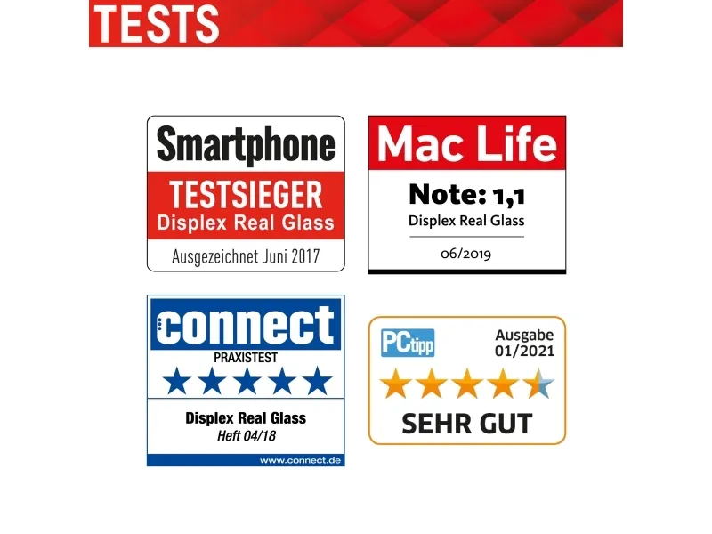 High-tech splinter protection The high-tech shatter protection integrated in the Real Glass from Displex guarantees absolute safety even if the protective glass breaks. Thanks to the composite material of the second layer in the protective glass, it does not shatter and thus guarantees absolutely safe use. If the worst should come to the worst and the protective glass has absorbed a blow, fall or impact and is broken, the Displex protective glass can be easily pulled off the display in one piece thanks to the integrated high-tech shatter protection.