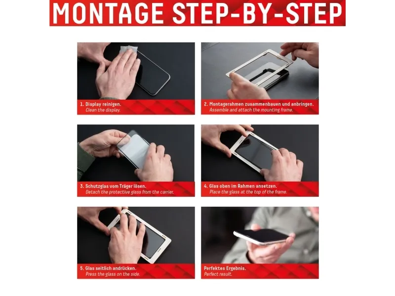 High-performance adhesive Once the protective glass has been fitted, the high-performance adhesive ensures optimum adhesion properties and a clear look. The adhesive is adapted to all display coatings of the various manufacturers so that the protective film for mobile phones holds reliably in the long term. The visual appearance is not affected either: despite the screen protection film, you can enjoy gripping videos and photos with maximum transparency and colour fidelity.