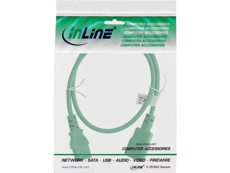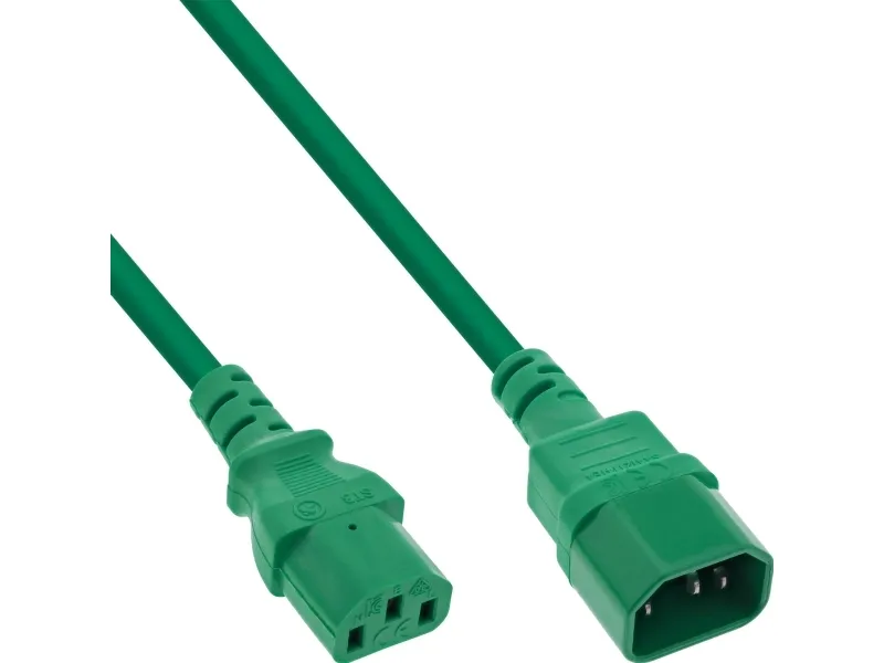 Power supply extension cable with 3-pin IEC connector, for extending the 250 V mains connection of PCs, monitors, printers and many other electronic devices in the computer sector. This cable can also be used for uninterruptible power supplies (UPS) or multiple power supplies (PDUs).InLine cold device extension, C13 / C14, green, 2m. Cable length: 2 m, Connector 1: C13 coupler, Connector 2: C14 coupler, Cable type: H05VV-F. Input voltage: 250 V